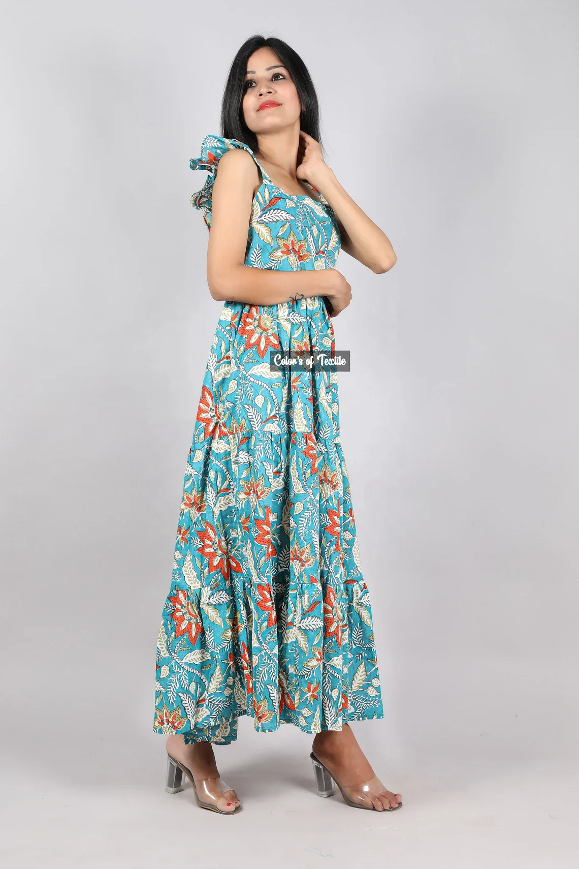 Indian Cotton Block Print Strap Maxi Dress for Summer Autumn Season Sustainable Nonwoven Weaving Solid Pattern