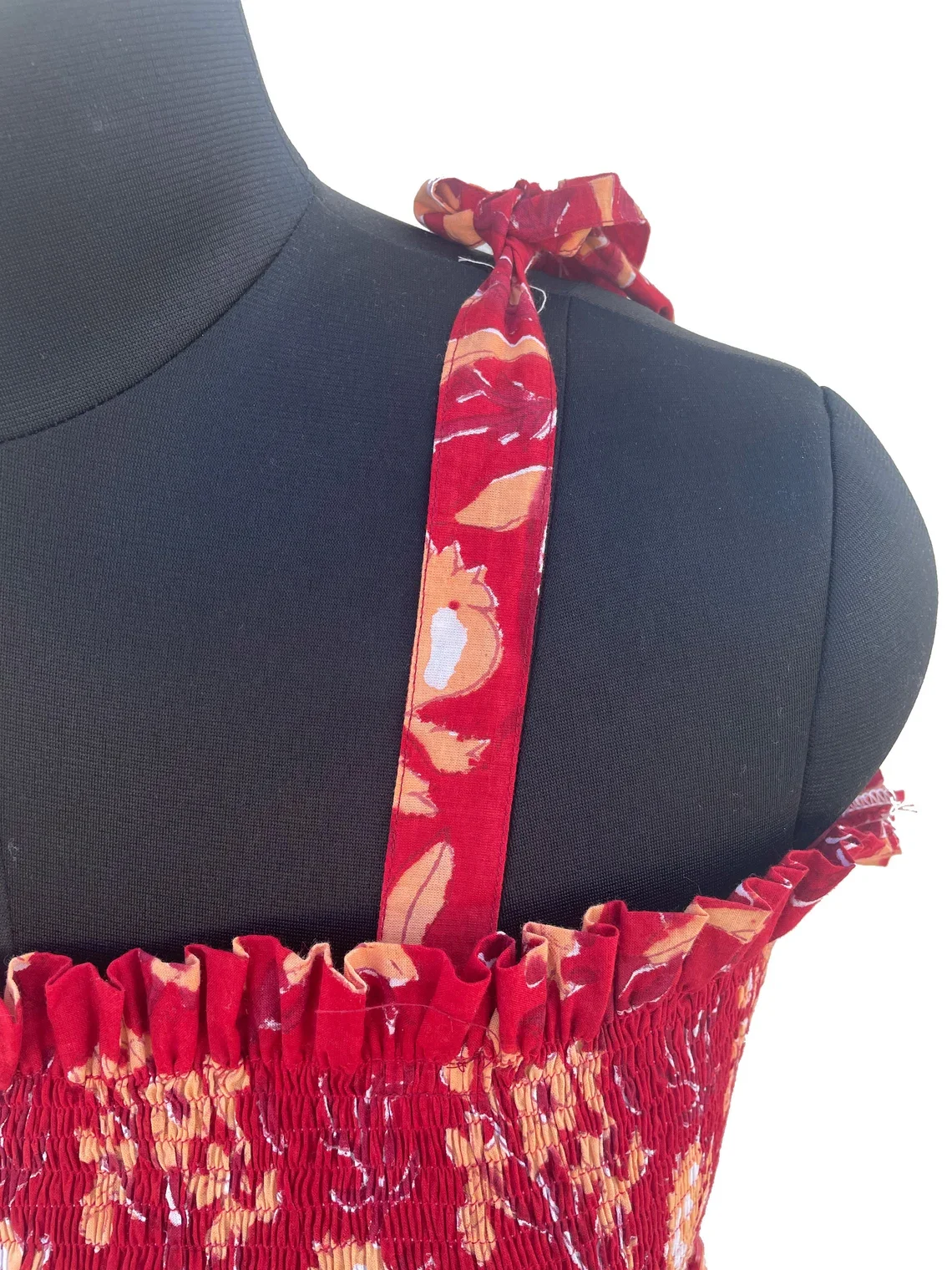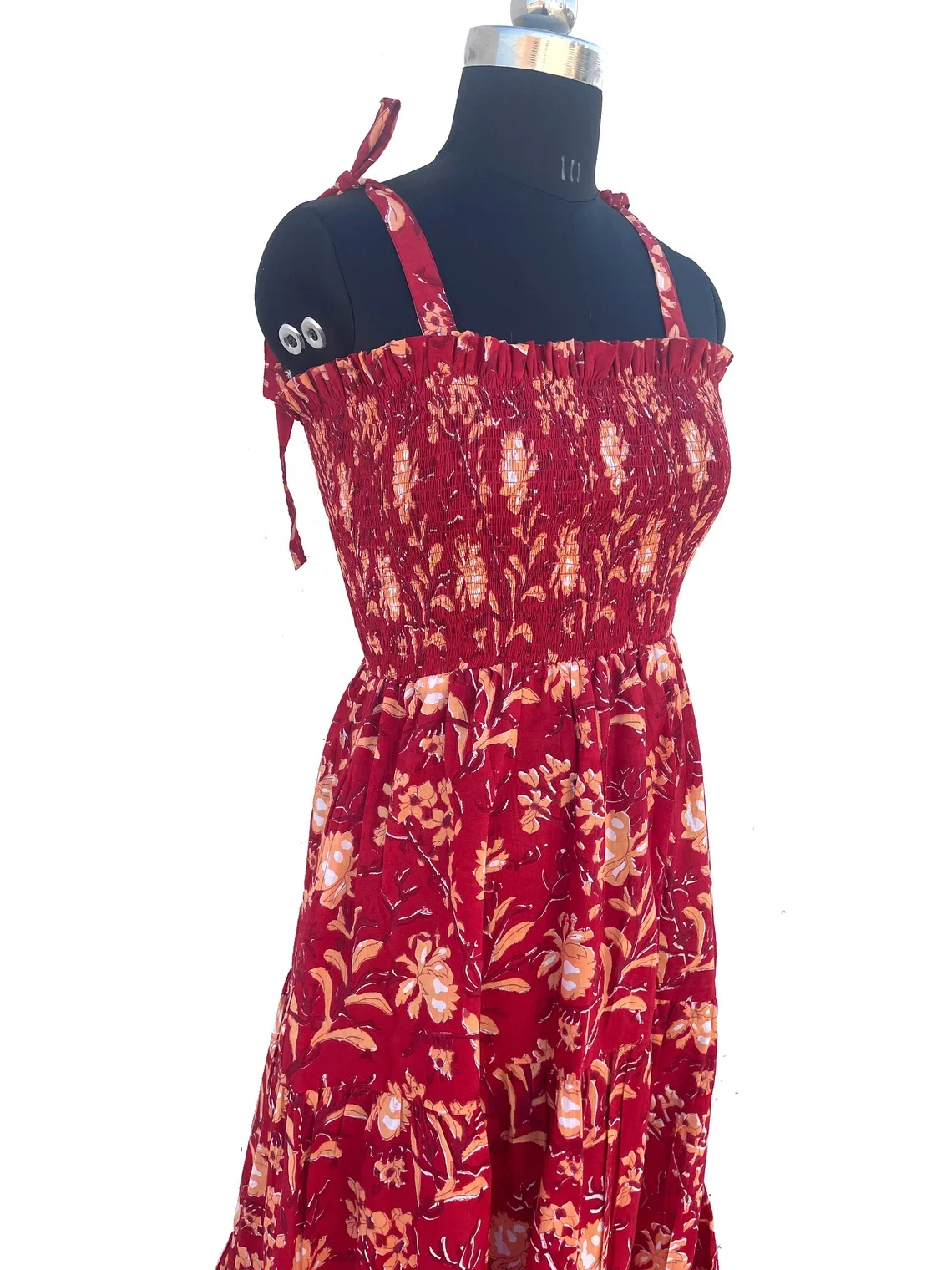 Indian Cotton Block Print Dress Tunic Elastic Red Tier Dress Sleeveless Square Neck Floral Print Partywear Long Maxi Dress