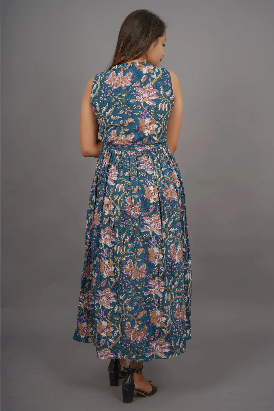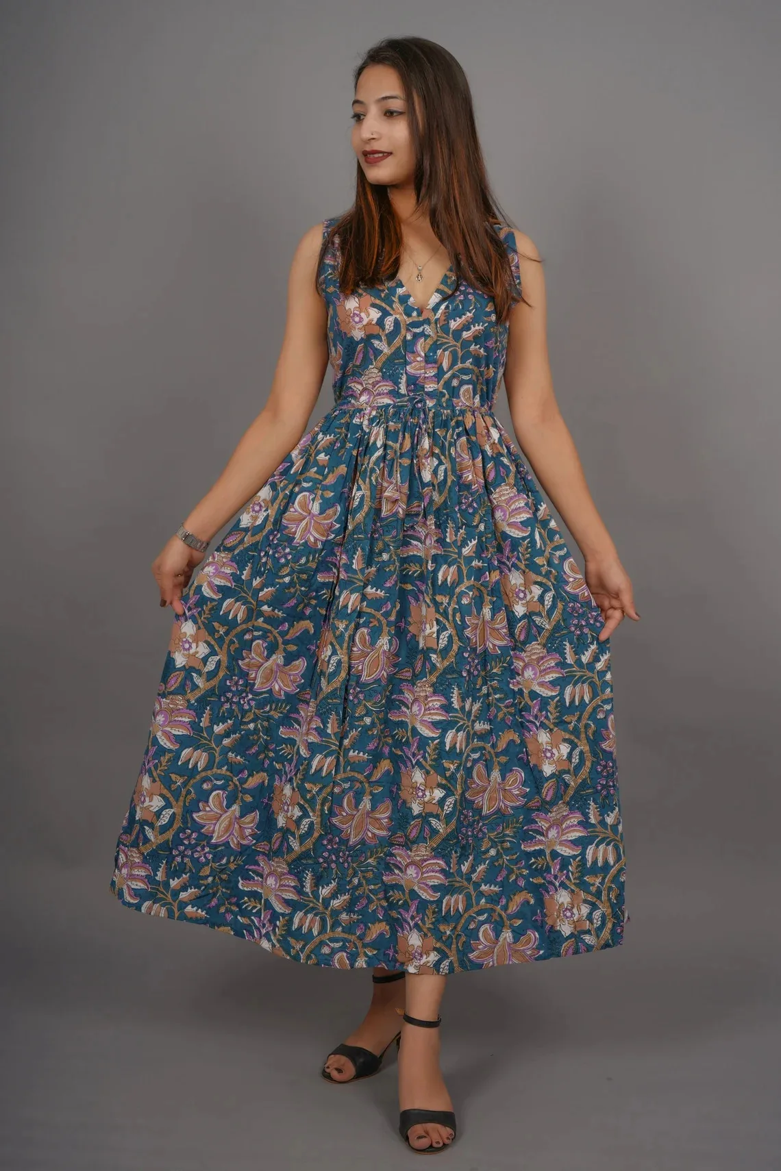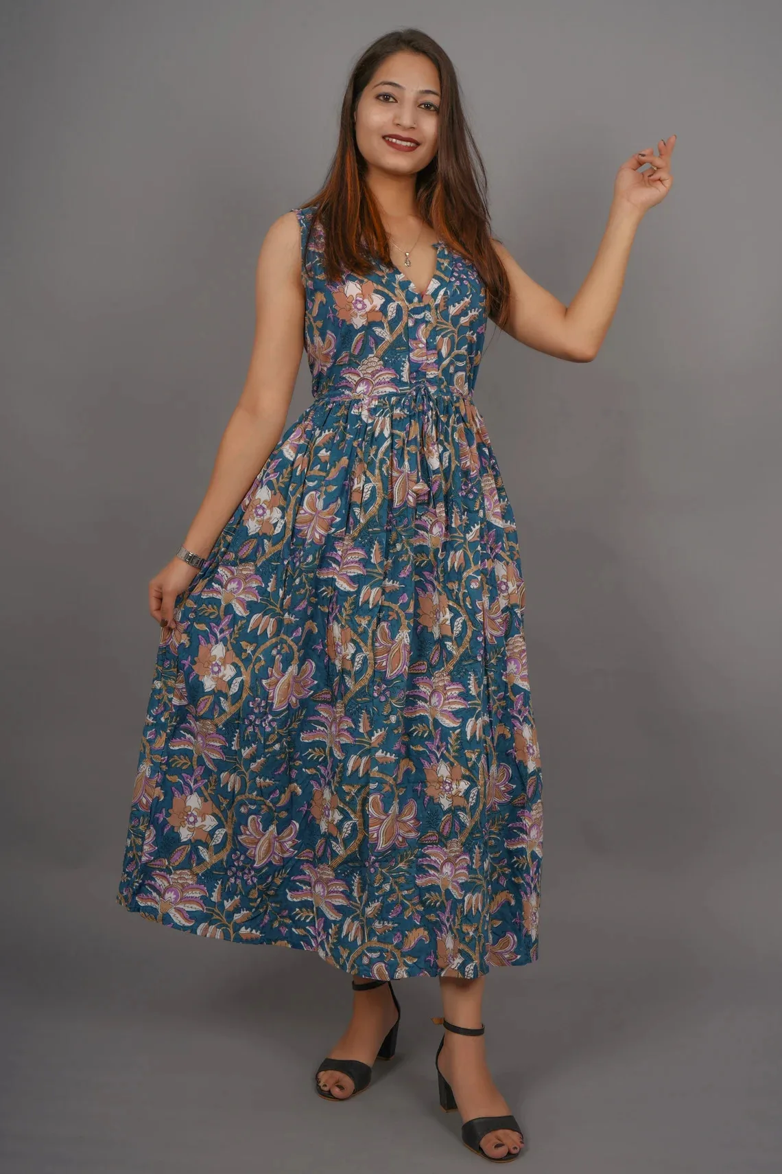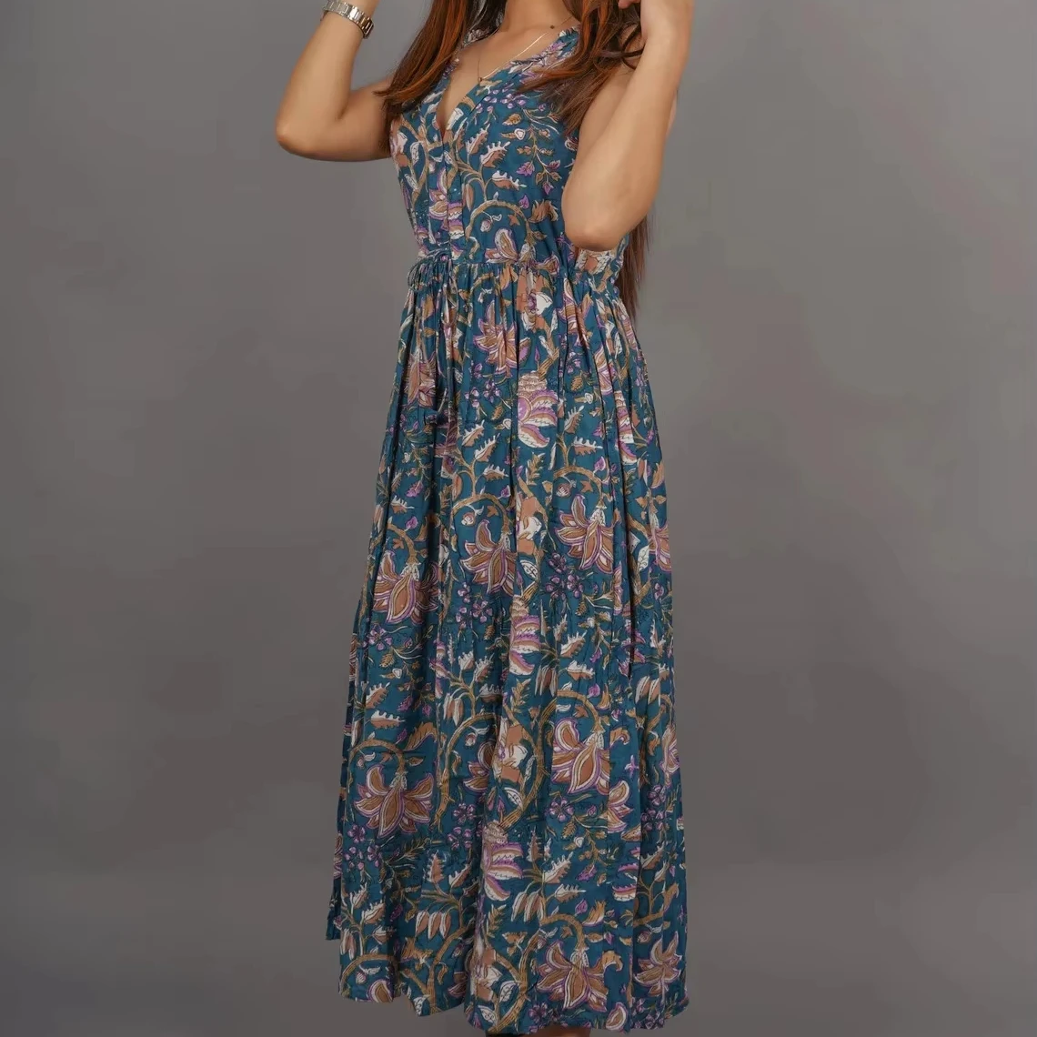 Hand Block Printed Cotton Maxi Dress Floral Handmade Summer and Autumn Season Nonwoven Weaving Method