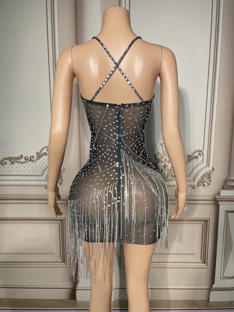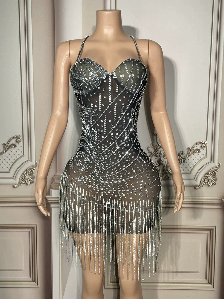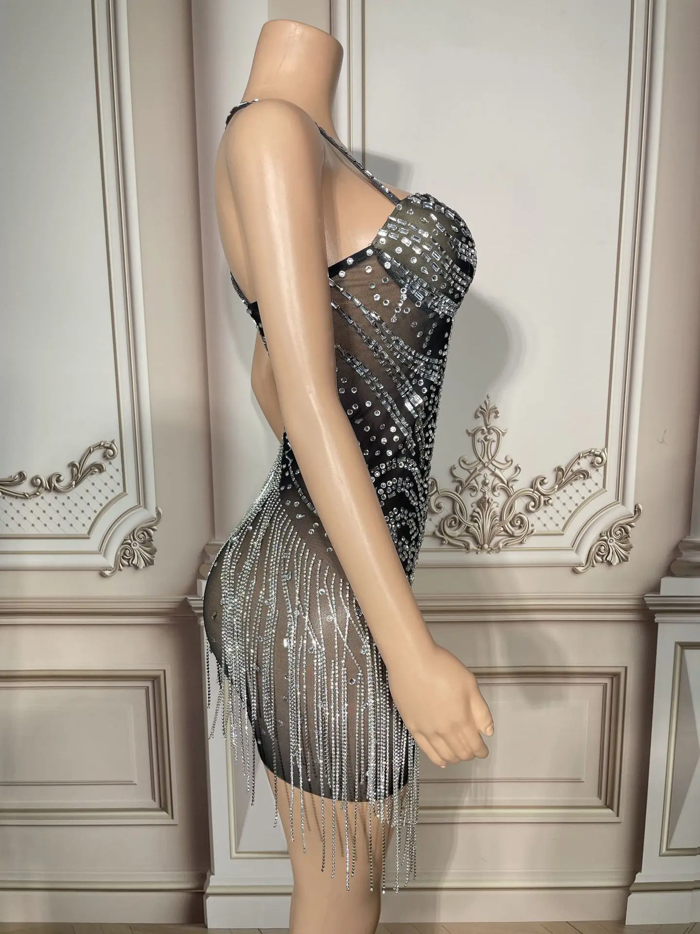 Women's Rhinestone Diamond Tassels Carpet Dresses Belly Dancing Evening Gown Mesh Black Sexy Heat-Transfer Performance Wear