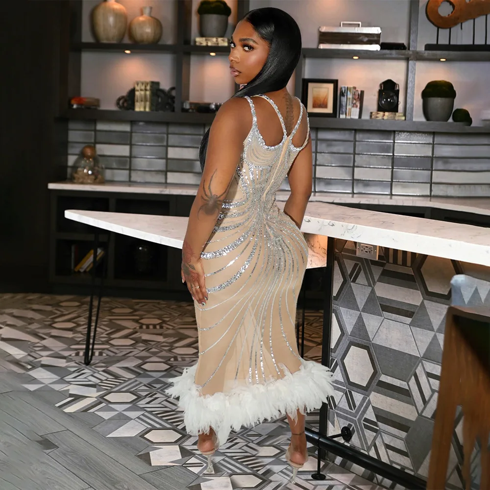 CY901559 Summer Luxury Fashion Floor-Length Sequins Party Evening A-Line V-neck Candy Color Dress Feather Trim Hem Natural Waist
