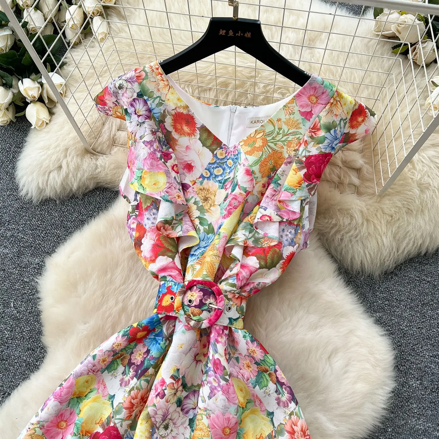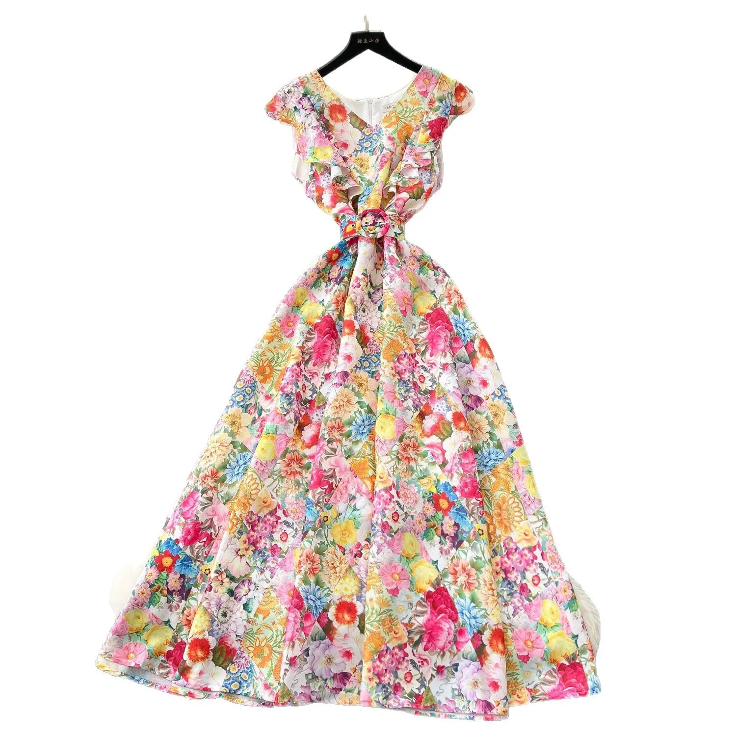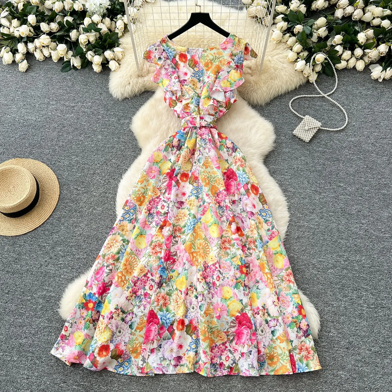 Women's Elegant Fairy Sleeveless Floor-Length Mermaid Dress Casual Woven Natural Floral Print French Style Ruffled Belt Slimming