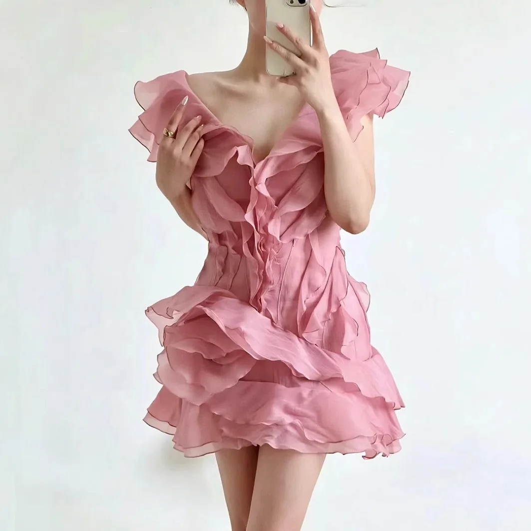 Vietnamese Niche Design Solid Mini A-line Ruffled Sexy V-neck Short Sleeve Front Logo Natural Waist Candy Color Dress Casual