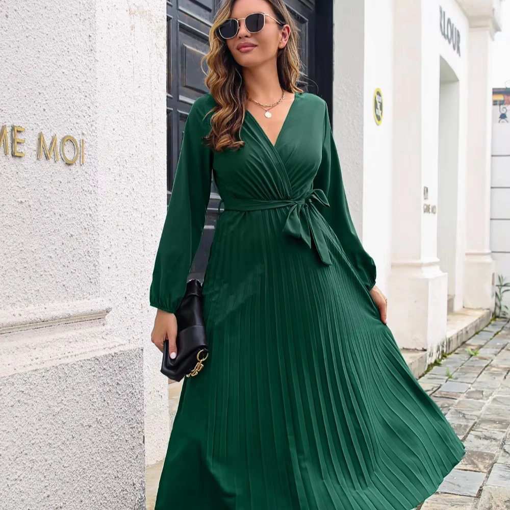 2026 Autumn Winter Women's Solid Chiffon Woven Floor-Length A-line Silhouette Dress Cross V-Neck Large Pleats for Party Occasion
