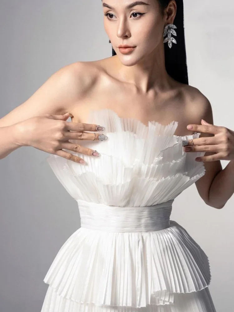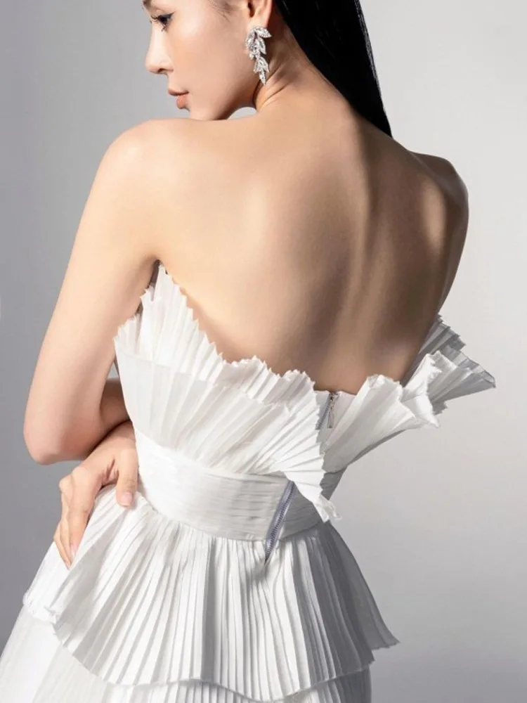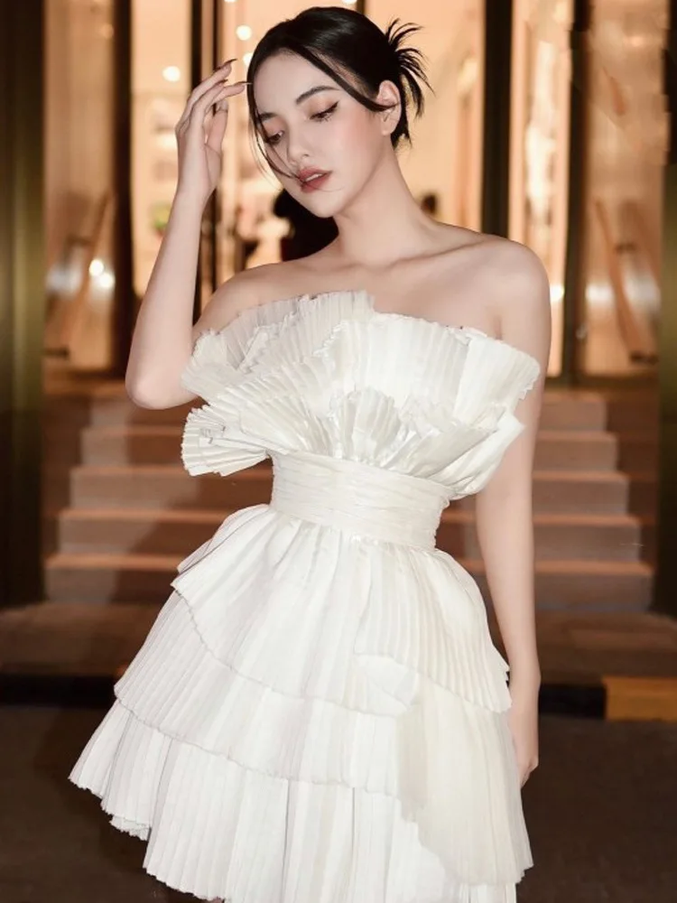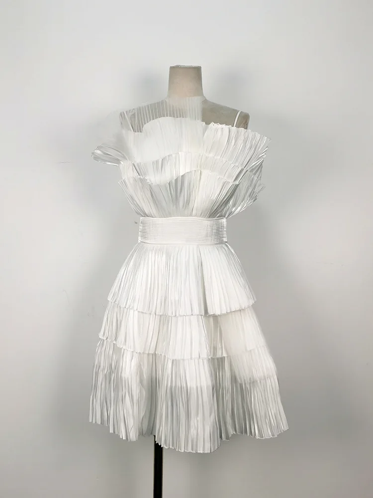 A-Line Three-dimensional Pleated Fan-shaped Chiffon Solid Digital Printing Woven Casual Party Dress with Ruffle