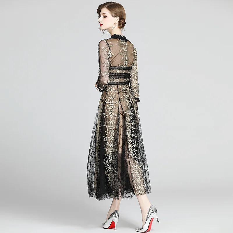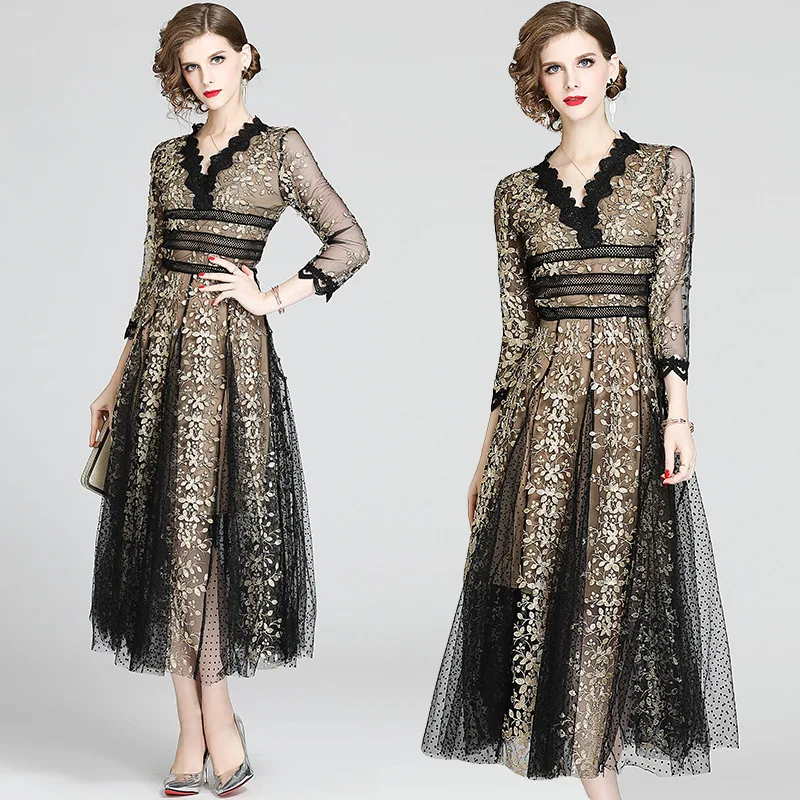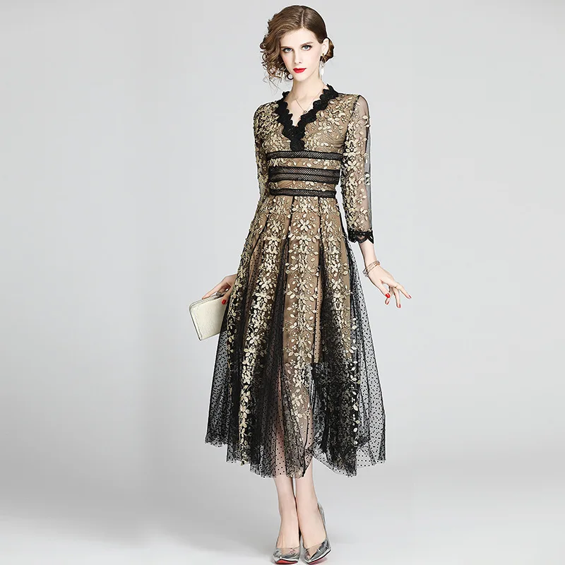 Women's Elegant Long Midi Party Dress Slim V-Neck Sleeves Casual Office Wear Woven Natural Waistline Washable Worsted Lace