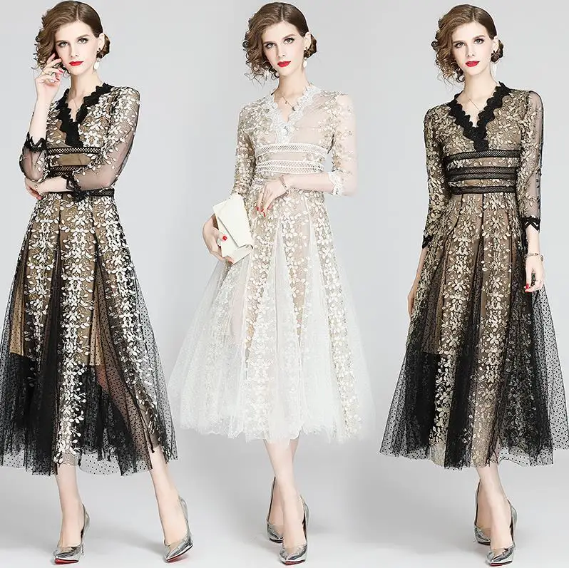 ZYHT 15325 Wholesale Spring Trendy Fashion Long Sleeve Dinner White Lace Black Velvet Elegant Party Dress Women Evening Dresses