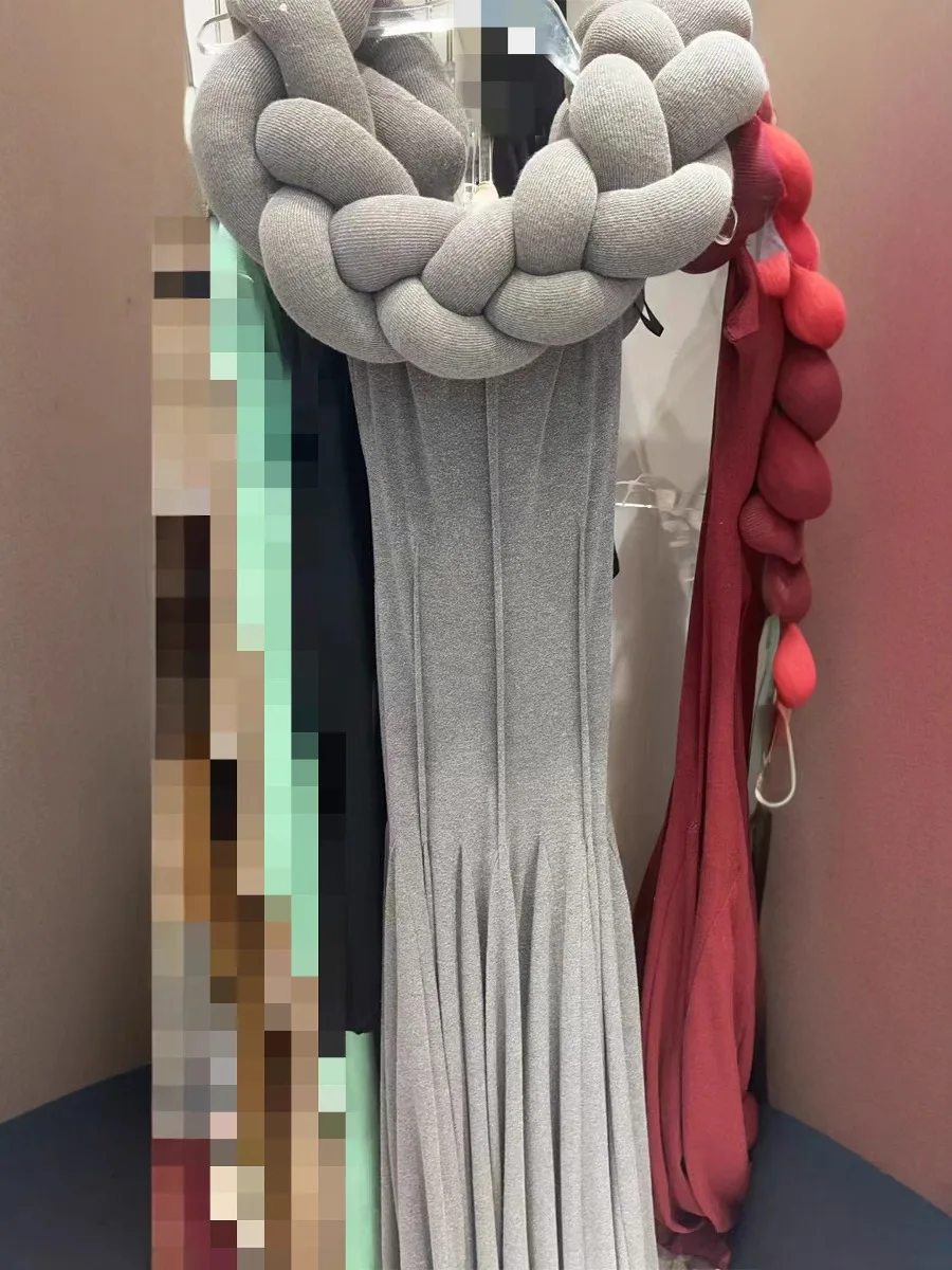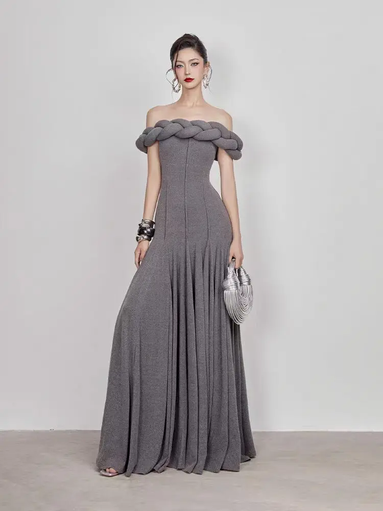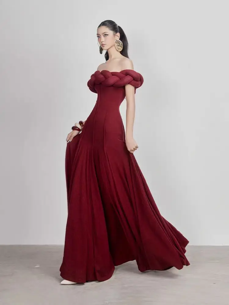 2026 Off-the-Shoulder Knitted Natural Waist Solid Chiffon Plain Dyed Straight Floor-Length Summer Red Casual Dress