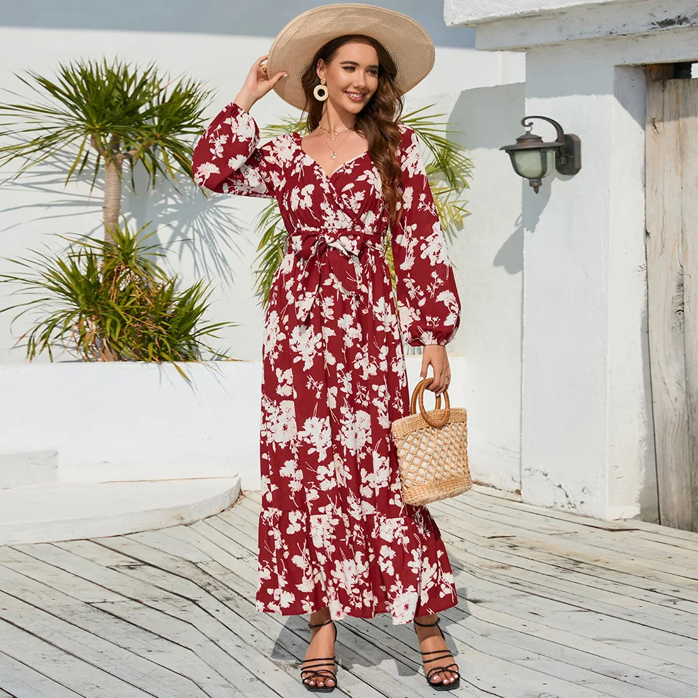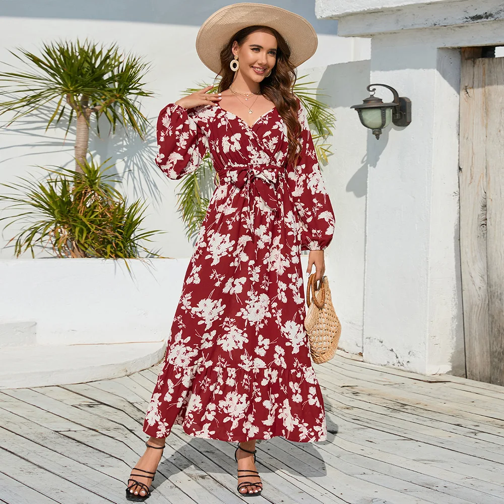 Women's Casual V-Neck Shift Midi Dress Long-Sleeved Floral Print Chiffon Breathable Digital Printing Natural for Summer Beach