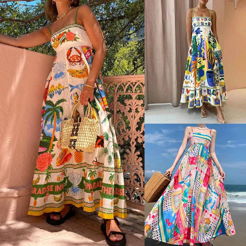 2026 European American Women's Spring Collection Strapless Floor-Length Sleeveless Sling Sexy Big Pendulum Graffiti Printing