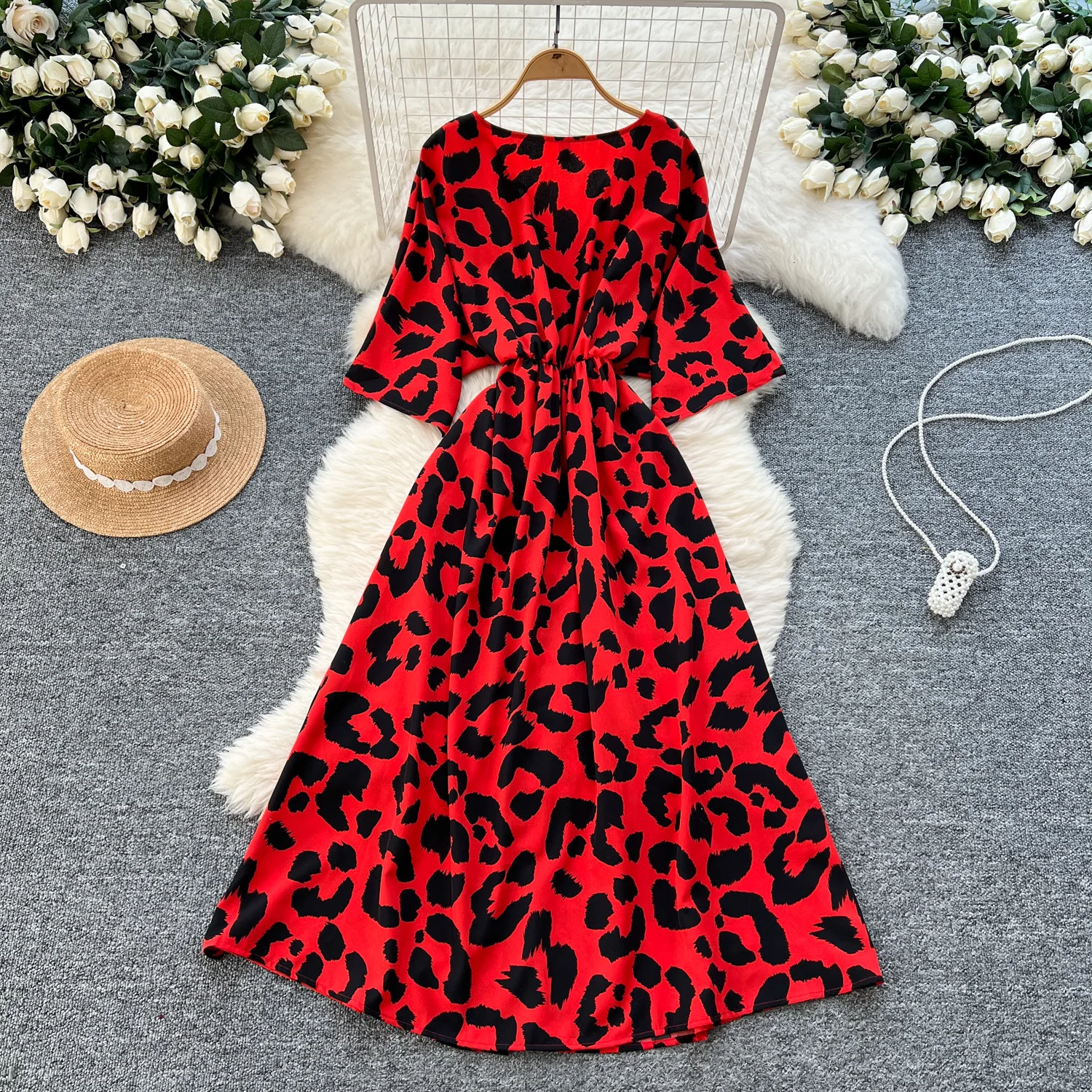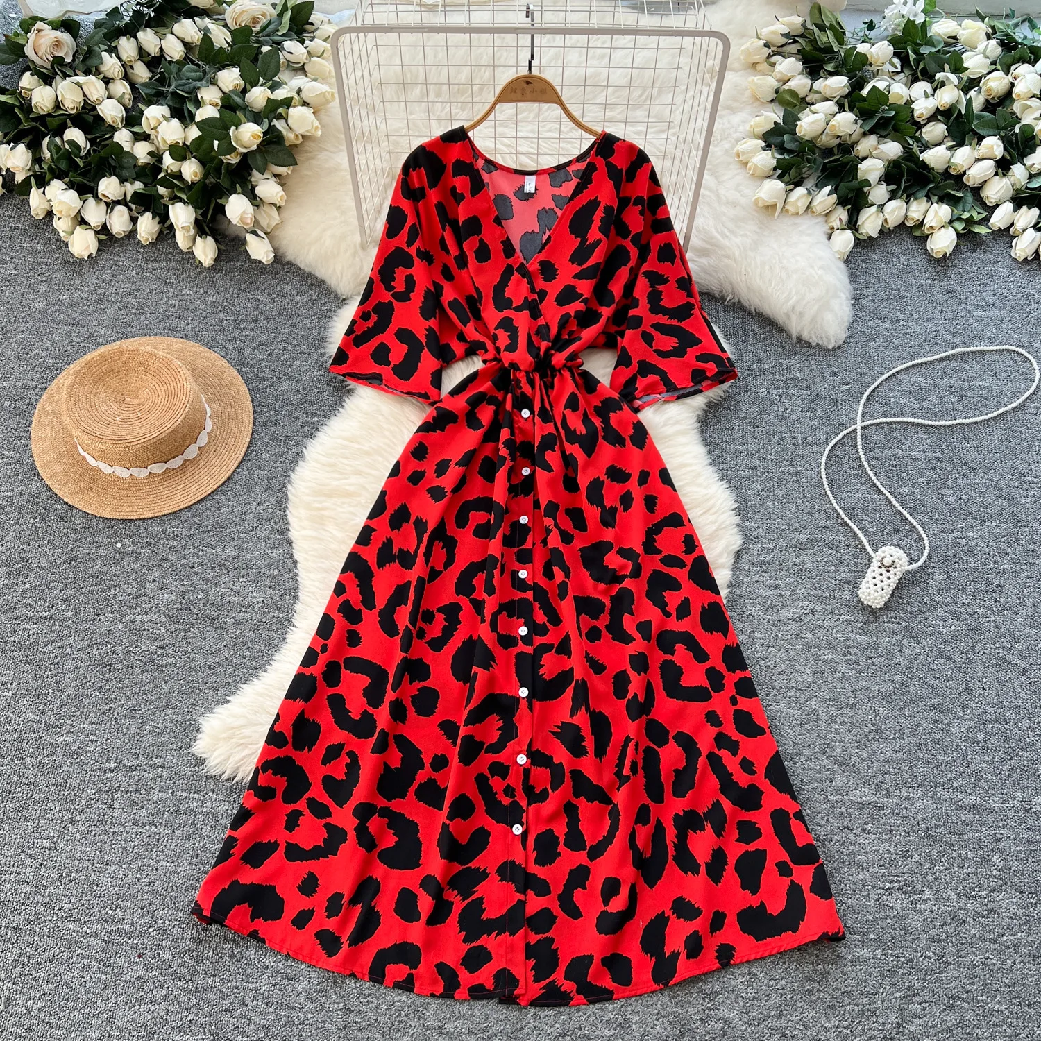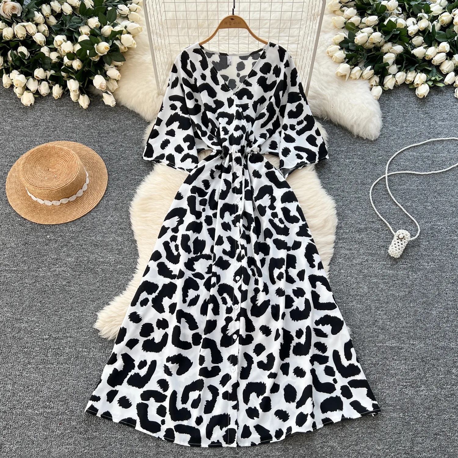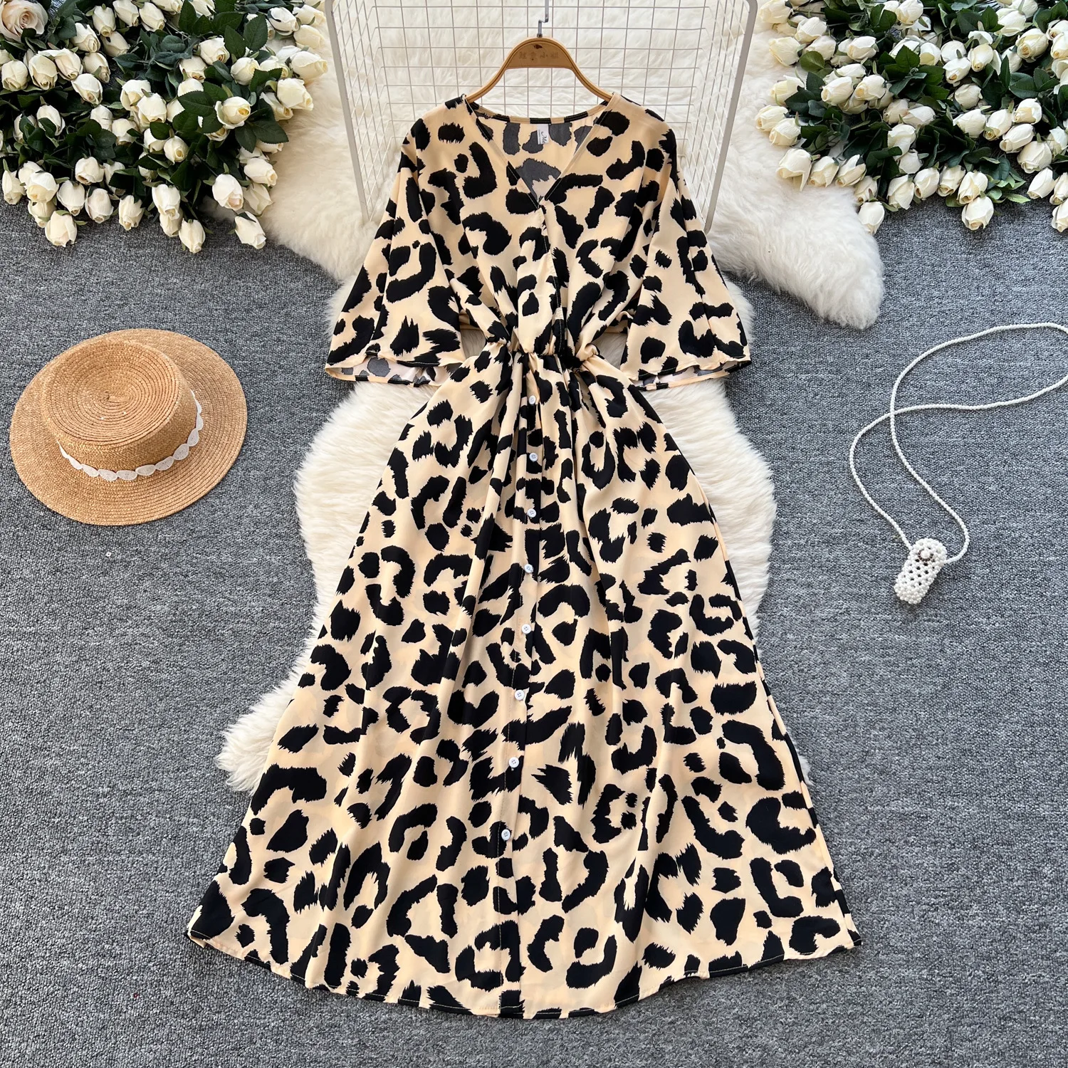 Women's Elegant A-Line Summer Dress V-Neck Leopard Printed Plus Size Short Sleeves Natural Waistline