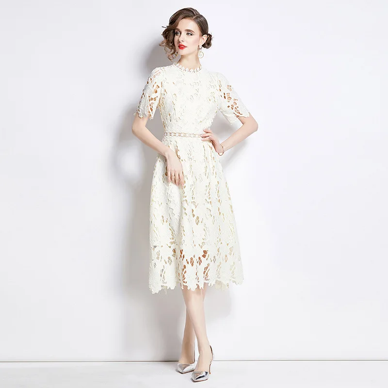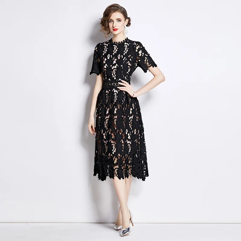 Women's Elegant Solid Pattern Long Midi Dress Slim Fashion Casual Smart Lace Short Sleeves for Summer Natural Waistline Digital
