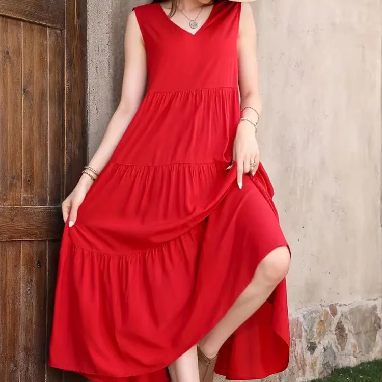 This Elegant Large-sized Chiffon Dress for Summer Women Features a Solid V-neck and a Loose Sewn Hem with a Natural Waistline