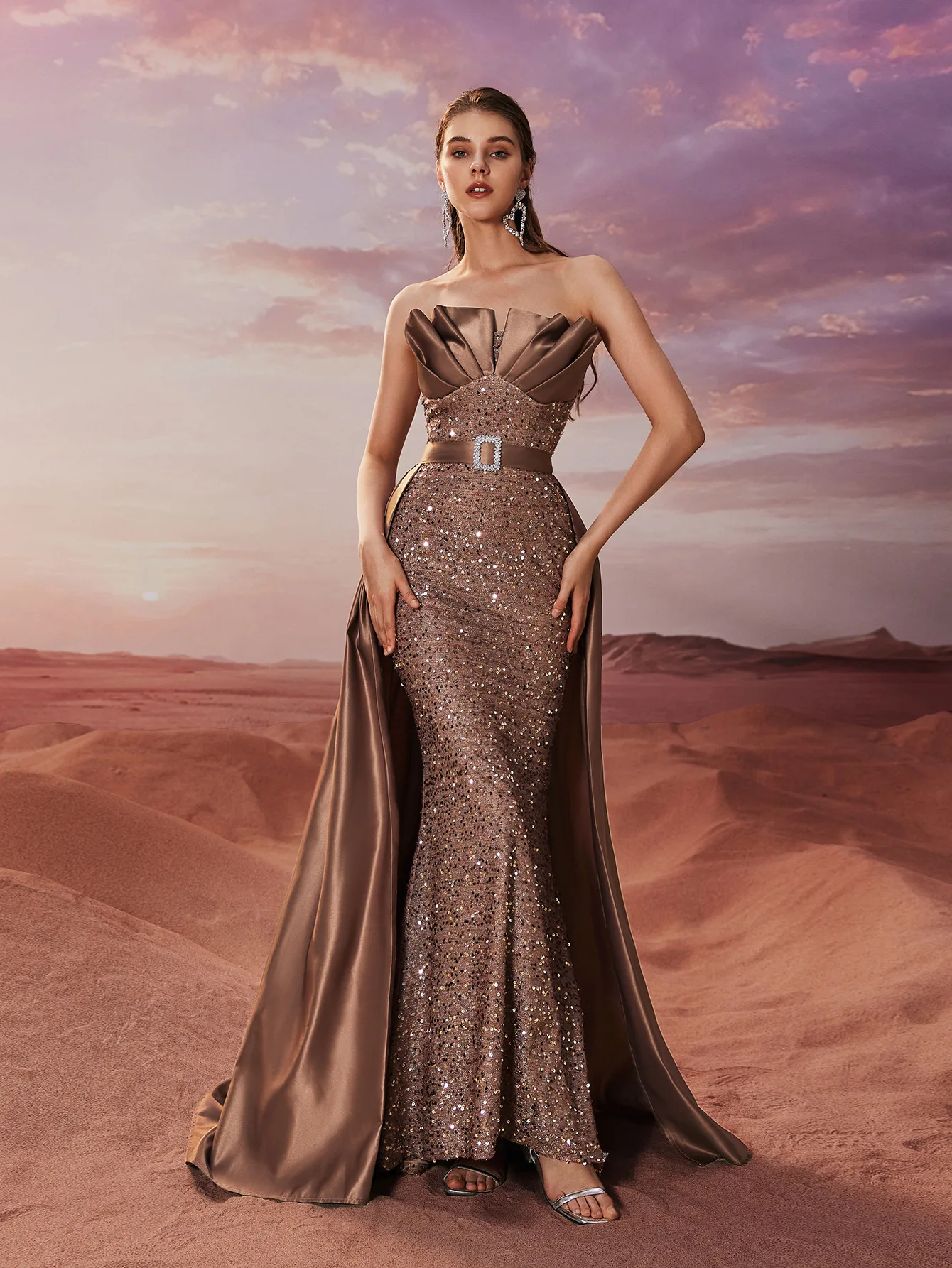 ZYHT 73957 Hot Selling Women Lady Printed Satin Beige Mermaid Fish Tail Floor Length Party Cocktail Evening Dress Gown