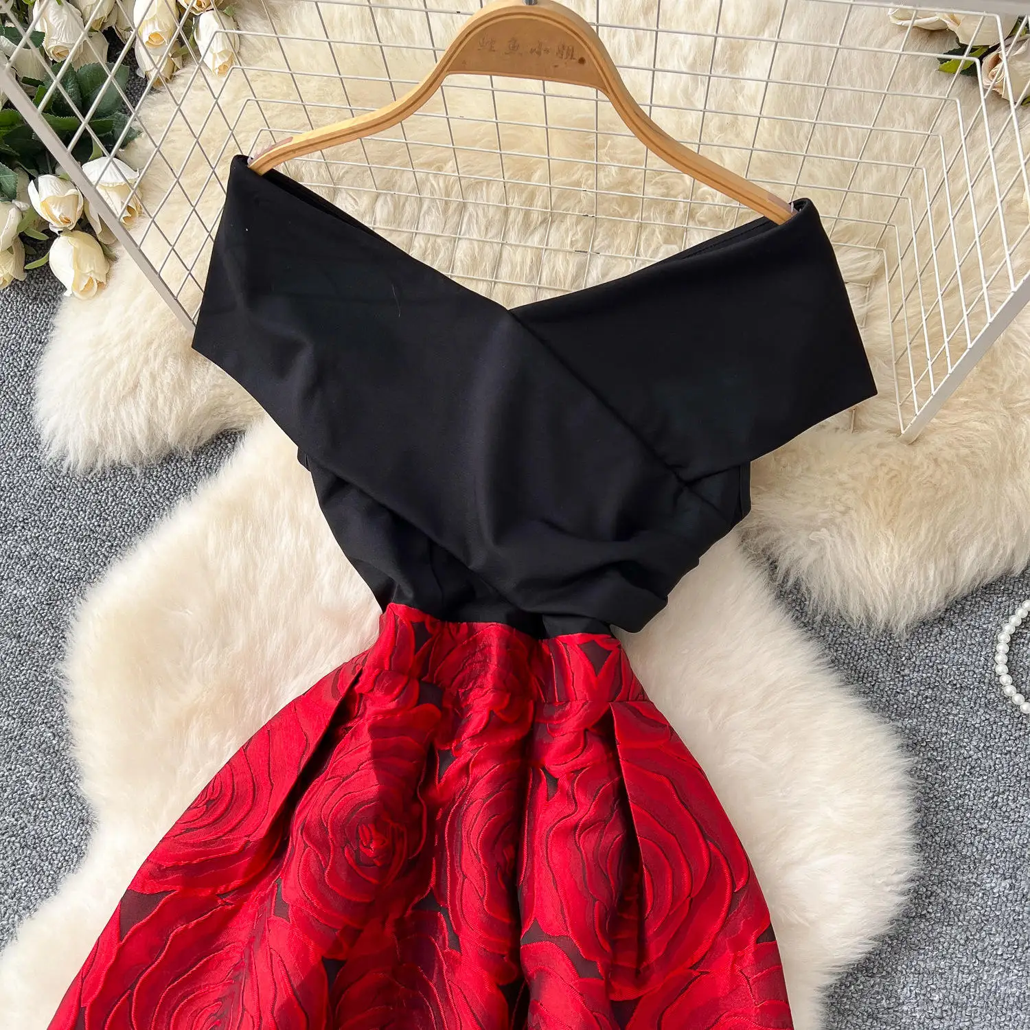 ZYHT 21938 Black Velvet Mini Dress Square Neck Long Puff Sleeves with Pearl Trim & Crystal Dess Flared Scalloped Hem Dresses