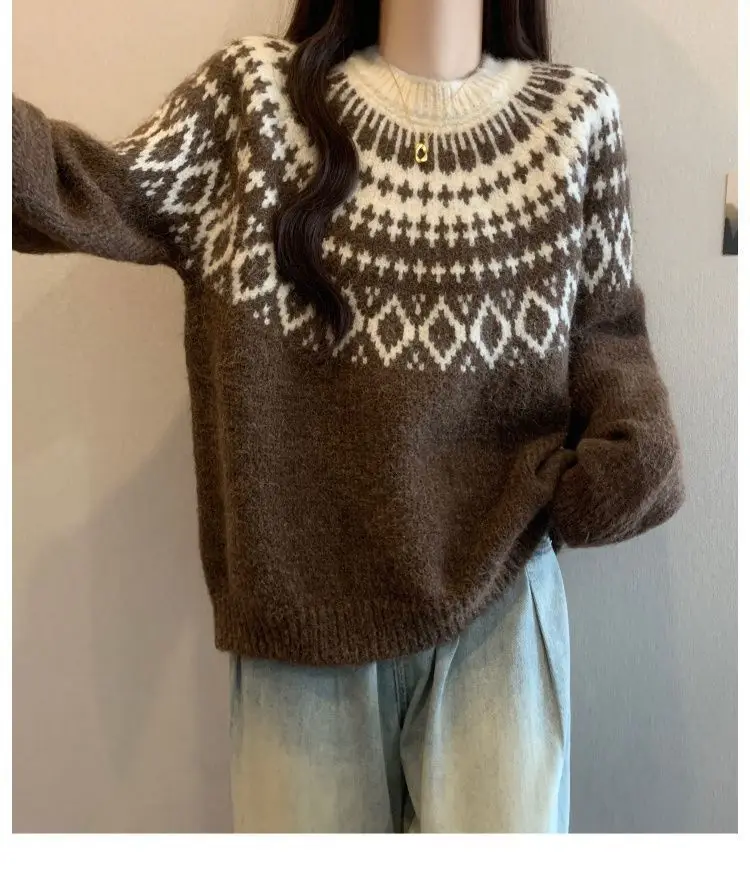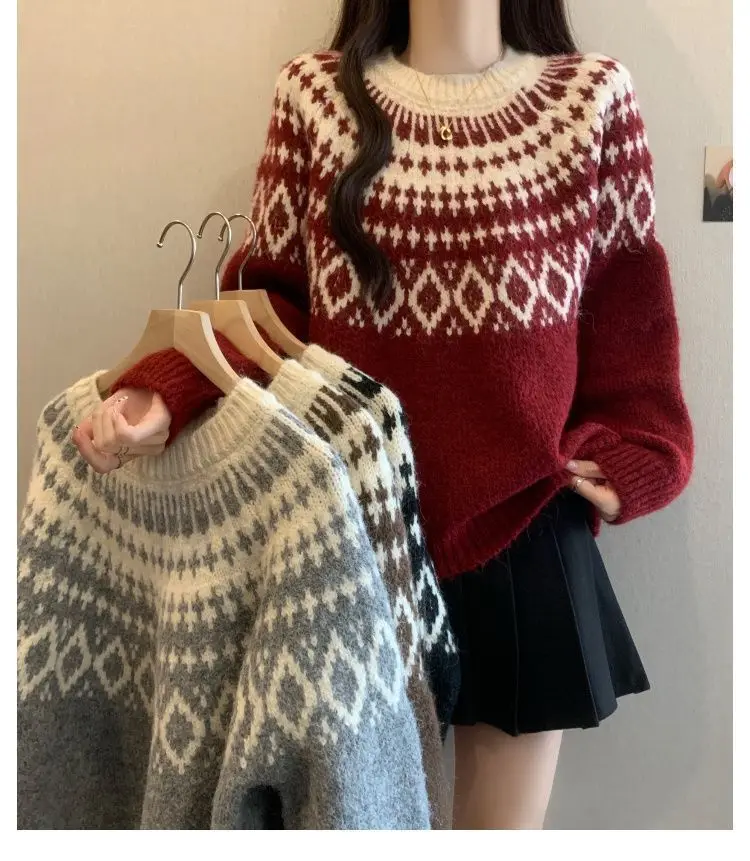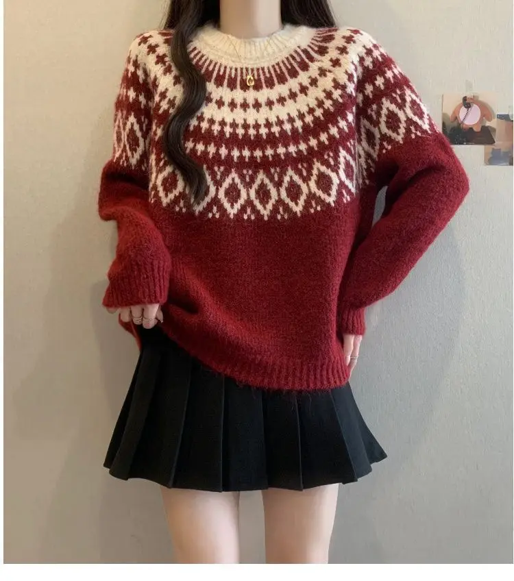Autumn New Christmas Jacquard Knit Sweater Women's Festive Pattern Red White Pullover 2026 Winter Warm Holiday Sweater