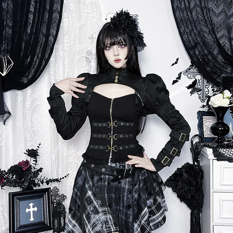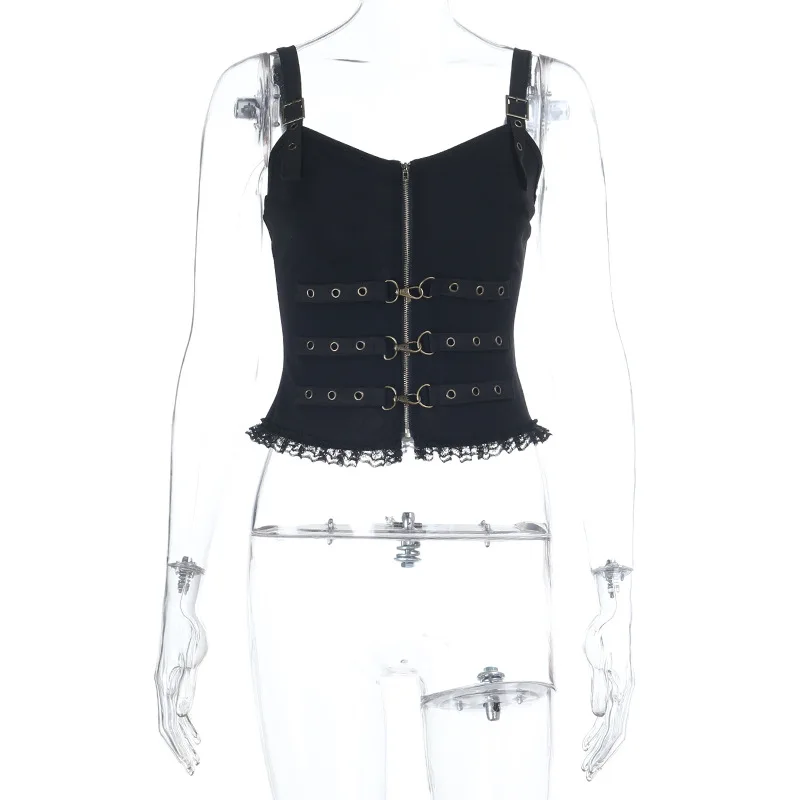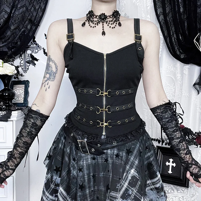 Gothic Metal Buckle Decorated Heart Neckline Built-in Camisole Dark Subculture Slim-fit Corset Strap Top