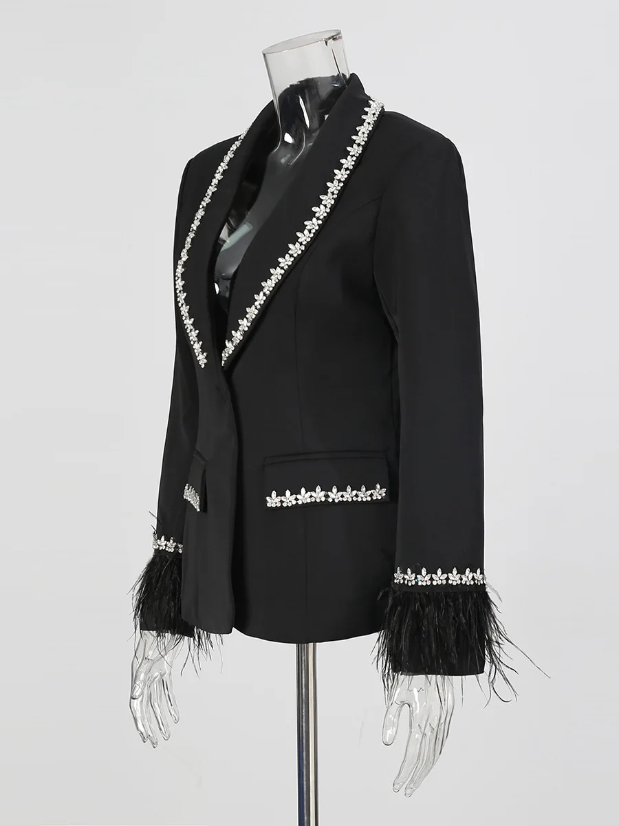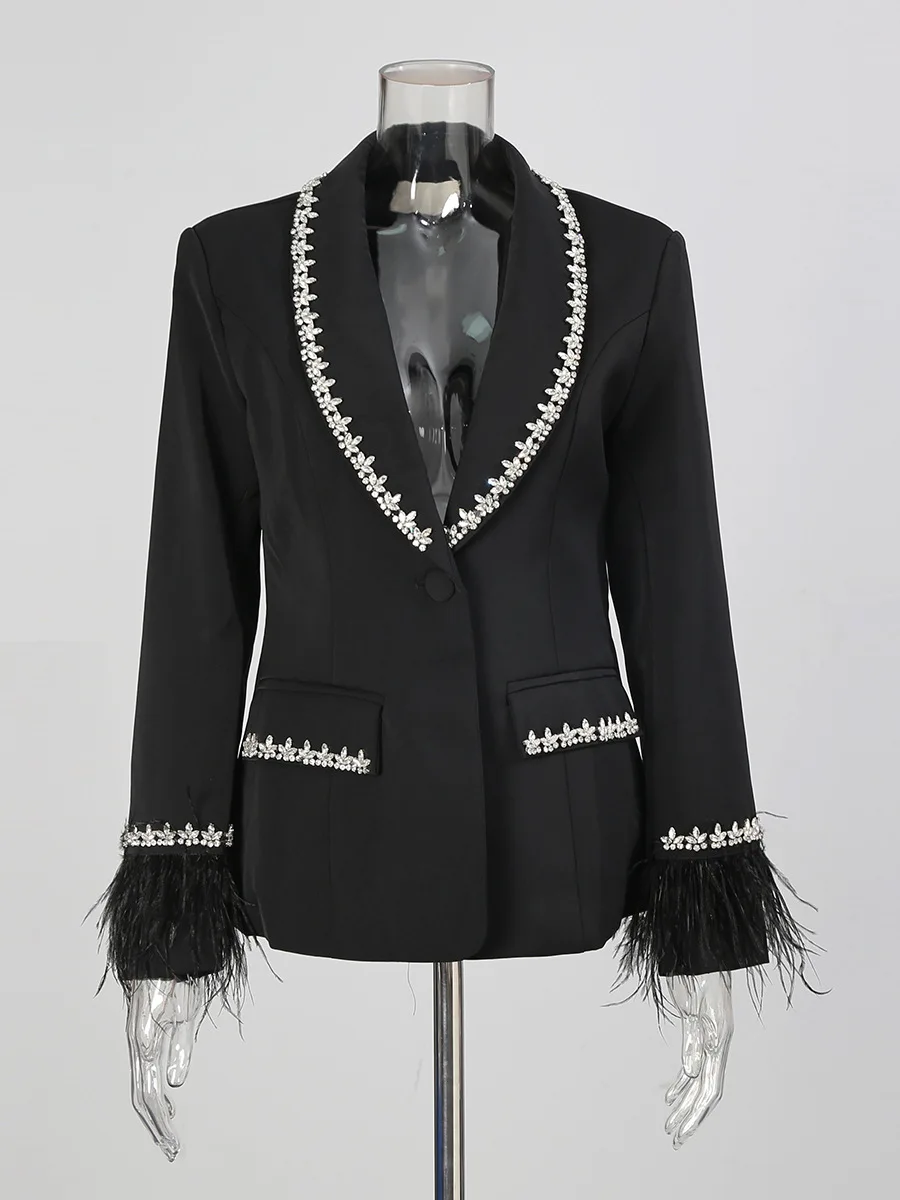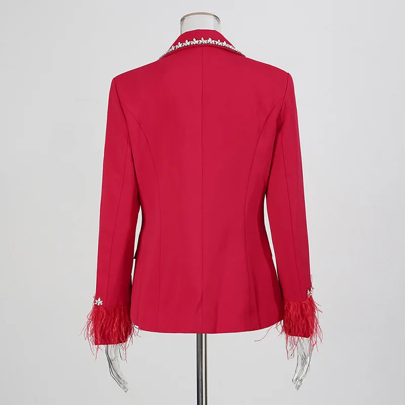 French Style Beaded Fringe Decor Deep V Blazer for Women - Luxury Socialite Slim-Fit Single-Breasted Suit Jacket