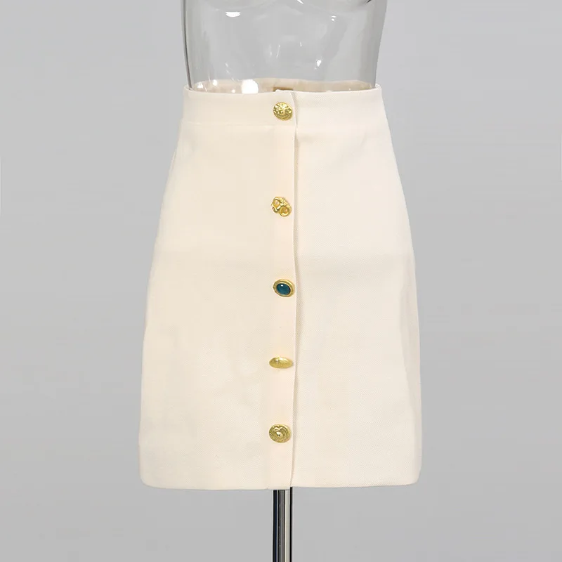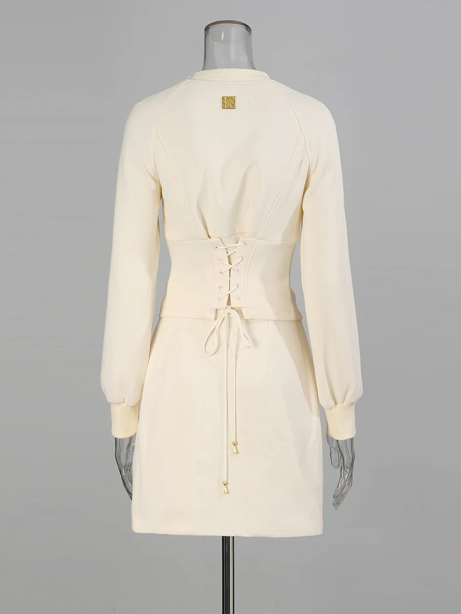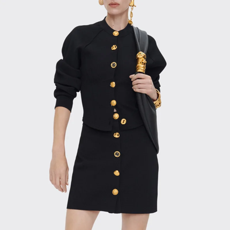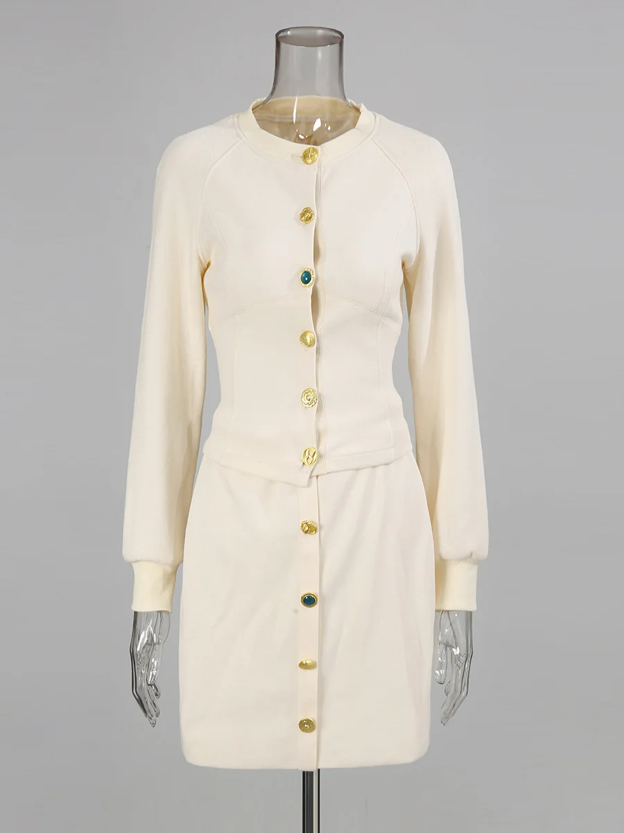 Office Lady Solid Autumn Elegant Vintage Metal Accent Knitted Set Slim Fit Long Sleeve Cardigan & Bodycon Mini Skirt Two-Piece