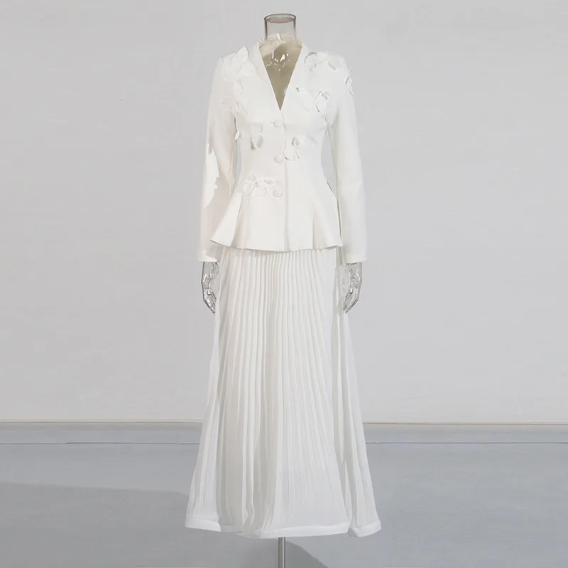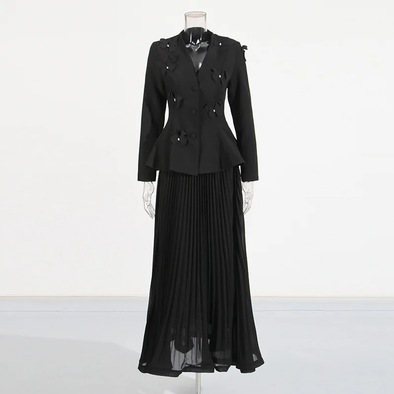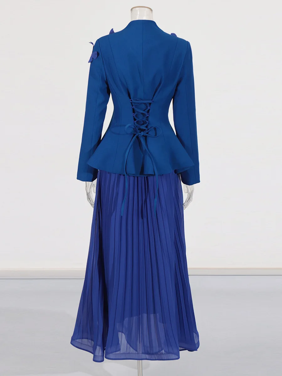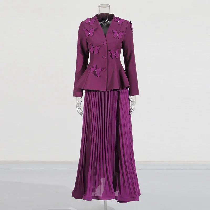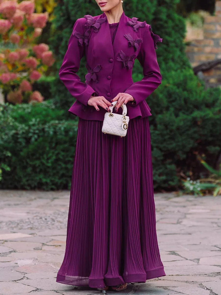 Purple 3D Butterfly Embellished Peplum Blazer & Pleated Maxi Skirt Set