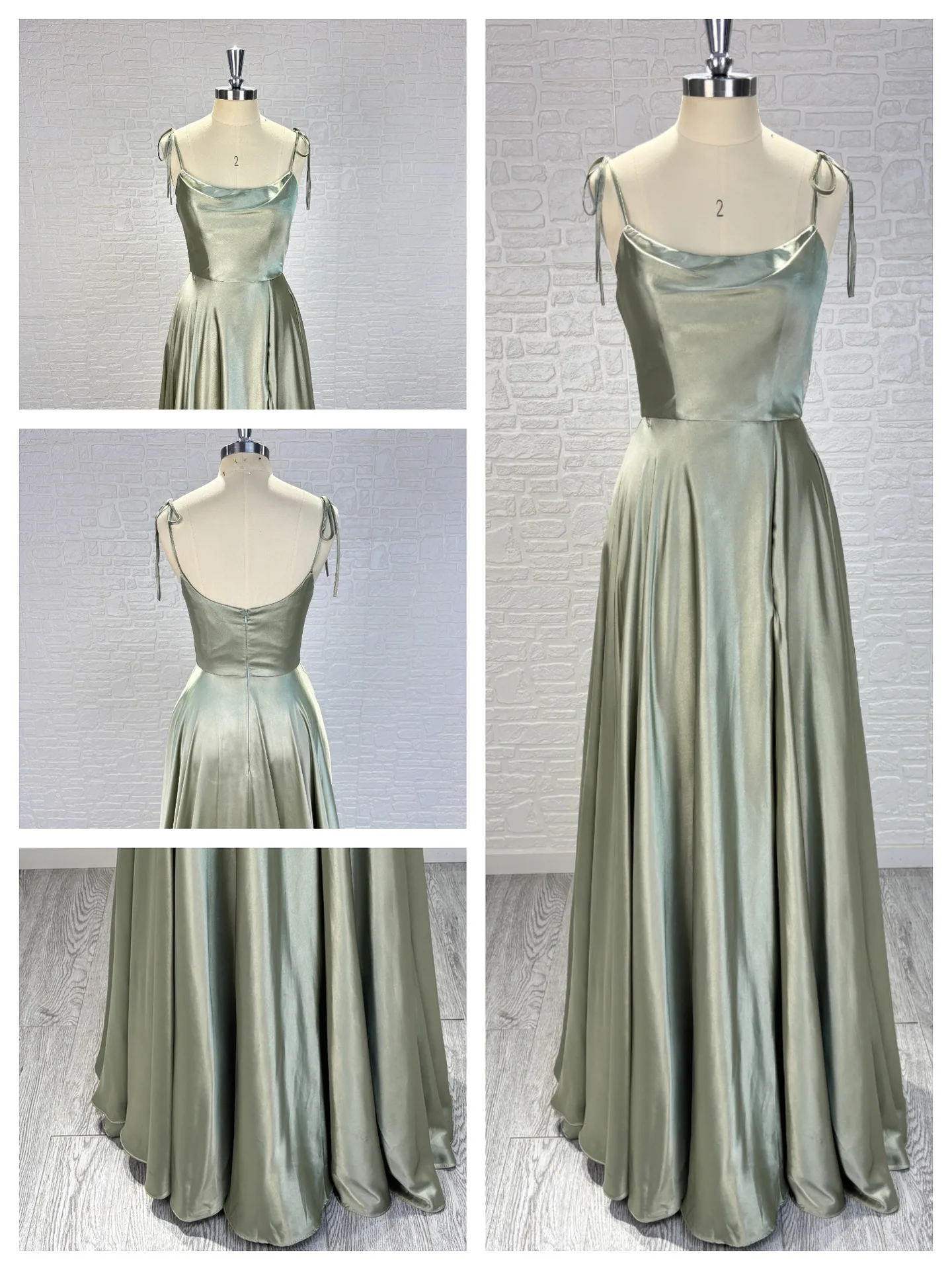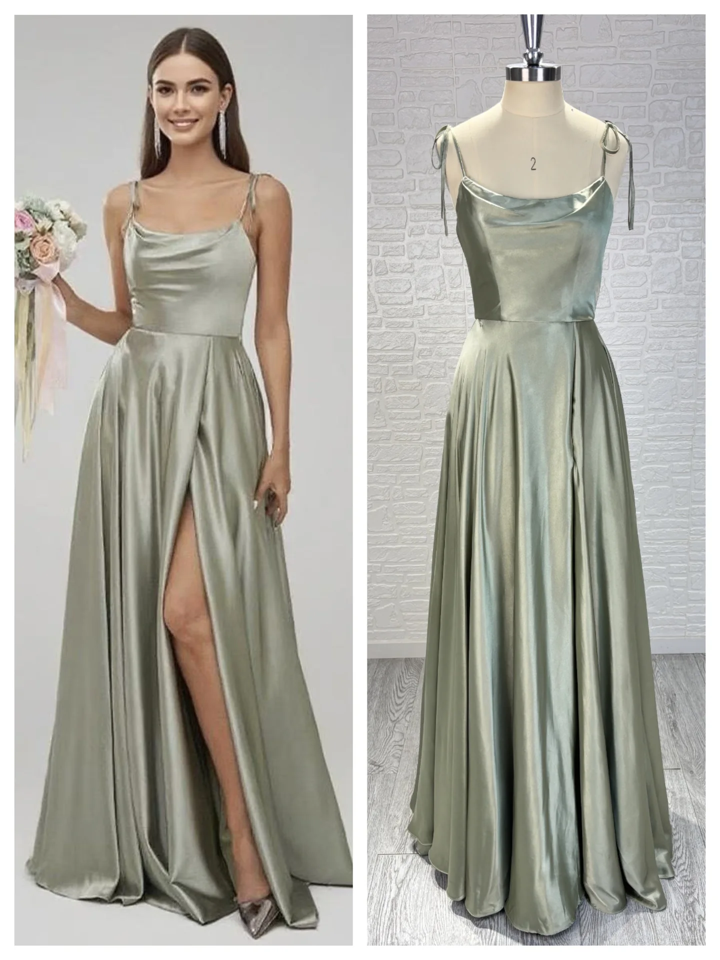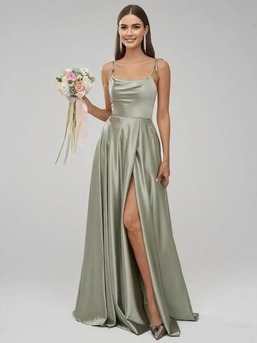 Satin Spaghetti - Strap Backless Maxi Dress with High Side Slit Blending Elegance with Sensuality Satin Gown Bridesmaid Dress