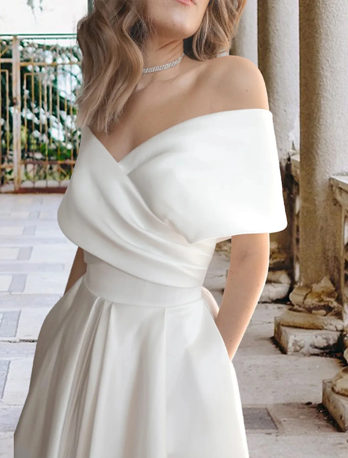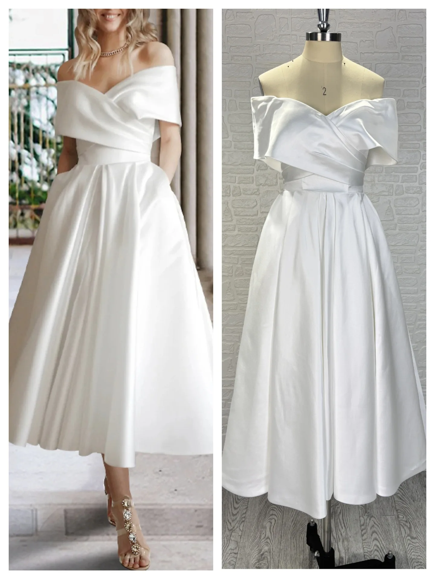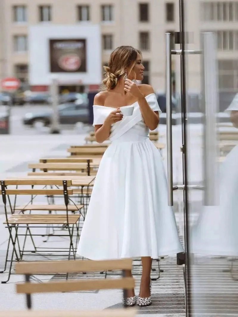 Elegant French off Shoulder Midi Inspired Strapless Satin Wedding Dress Playful European American Style