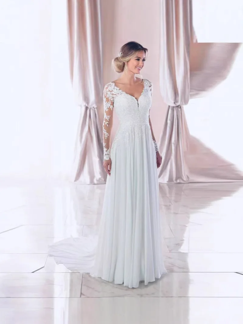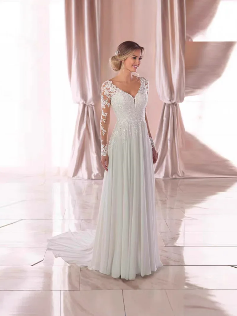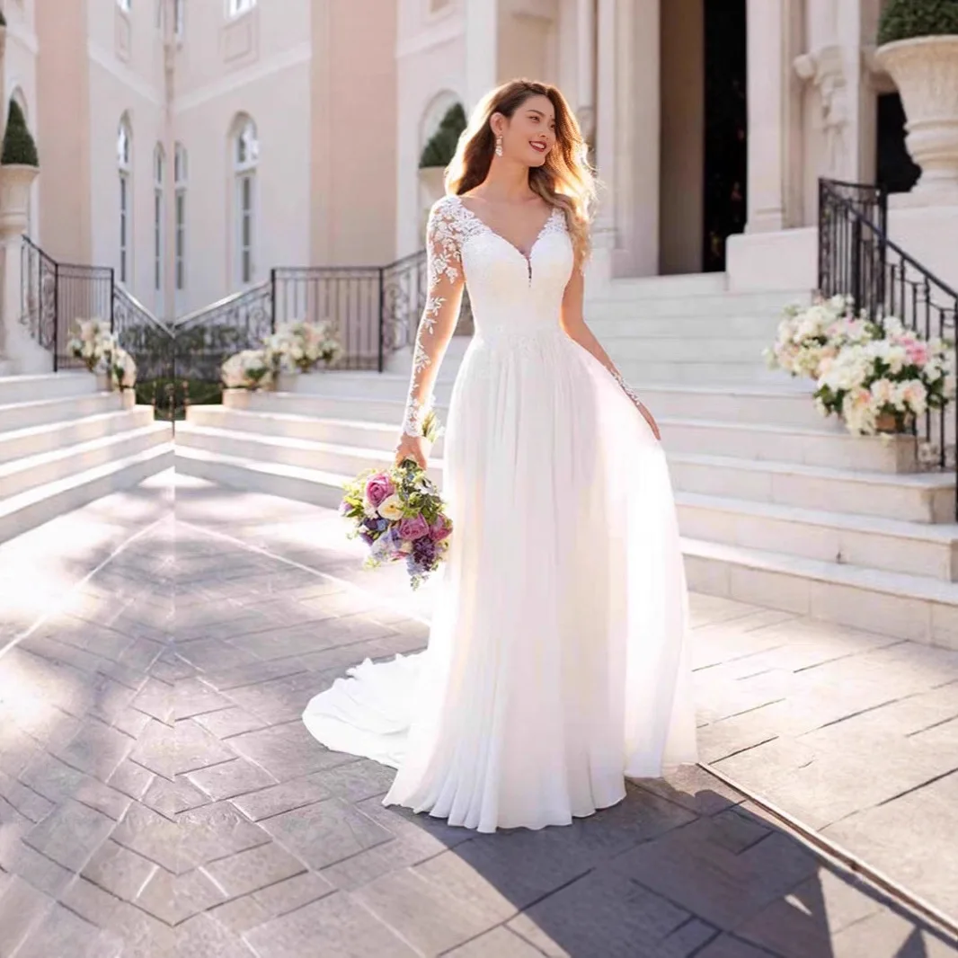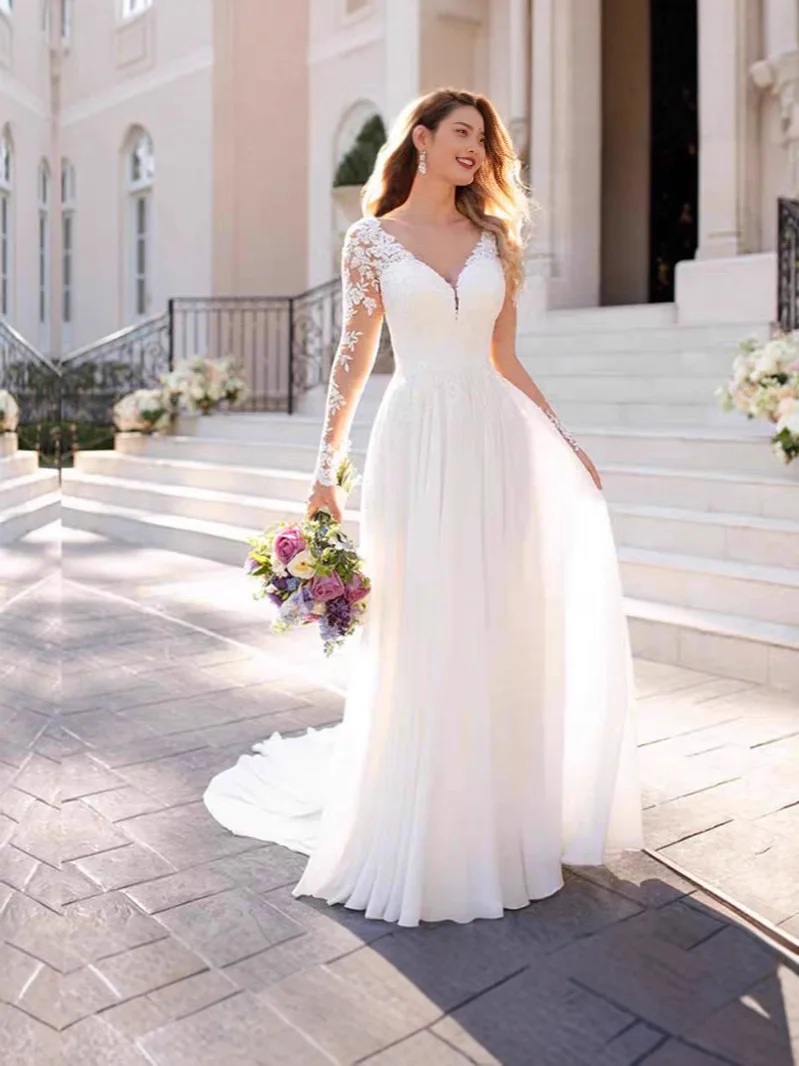European Elegant Long Sleeved Lace V Neck White Wedding Dress Embellished Bridal Gown