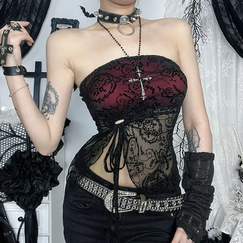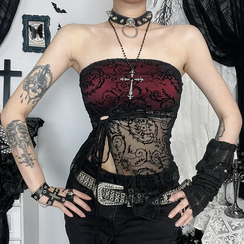 Neo Victorian Gothic Cross Embellished Sheer Lace Strapless Top Cross Chain