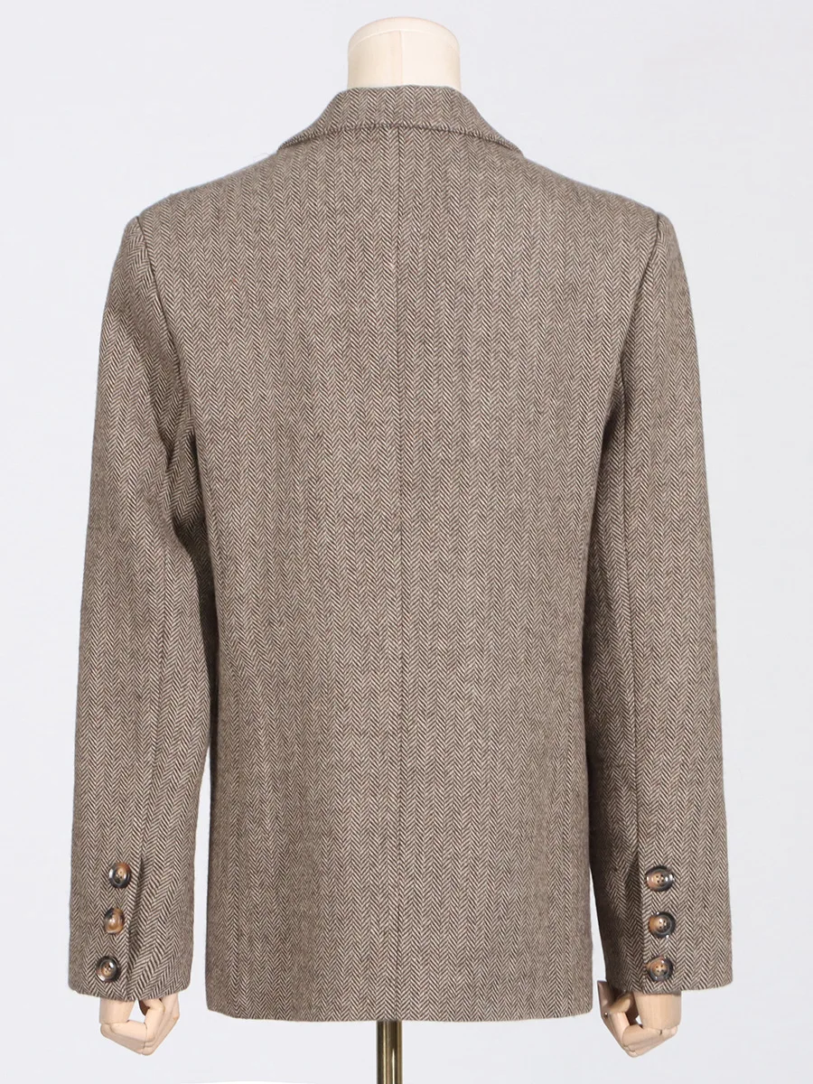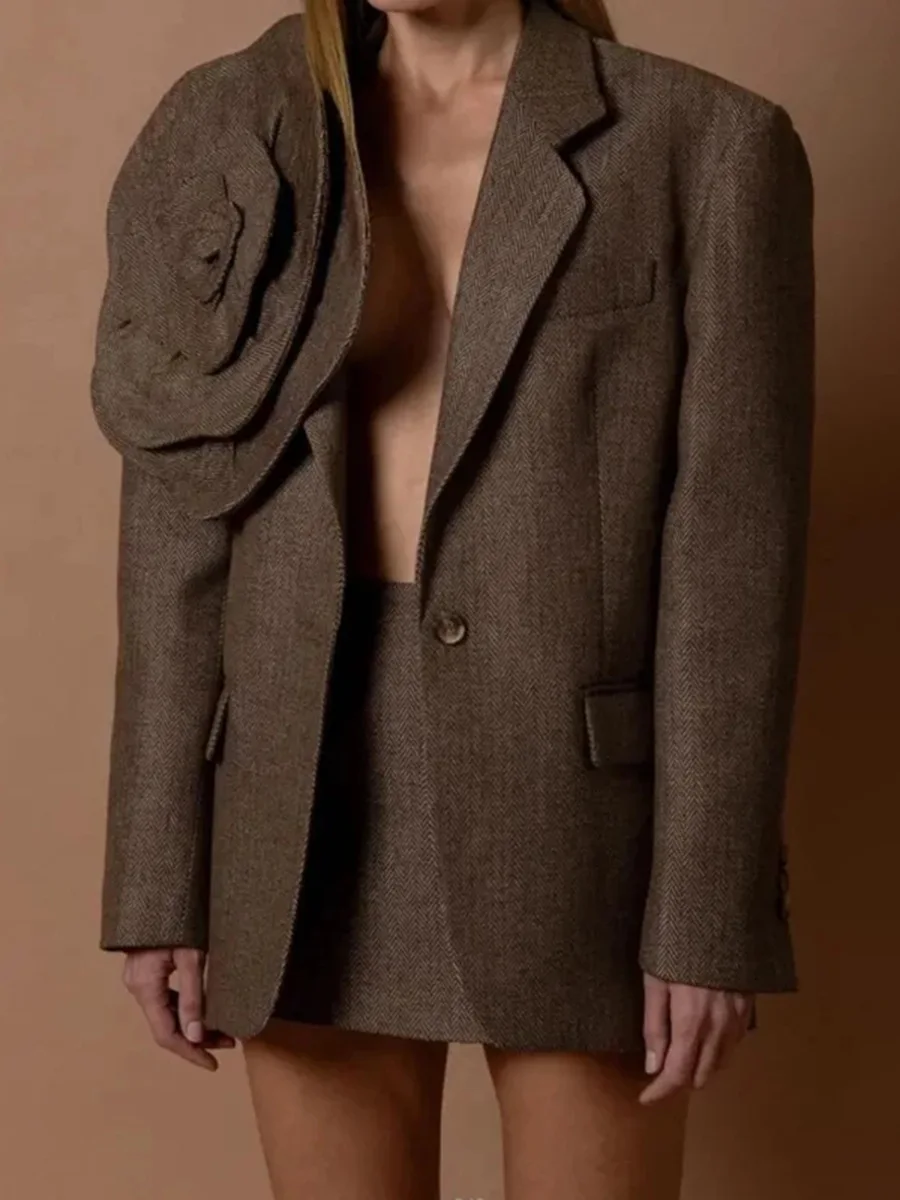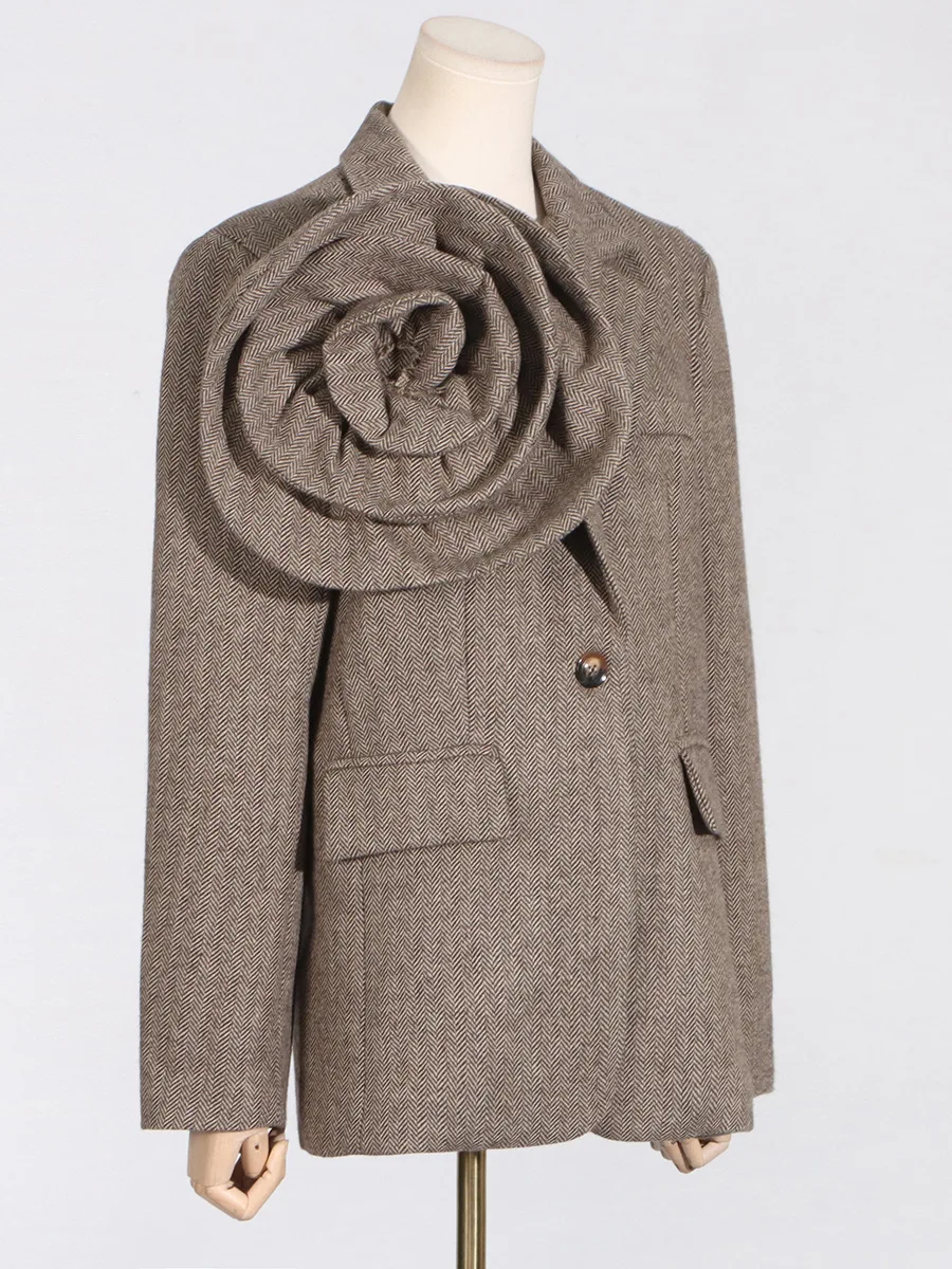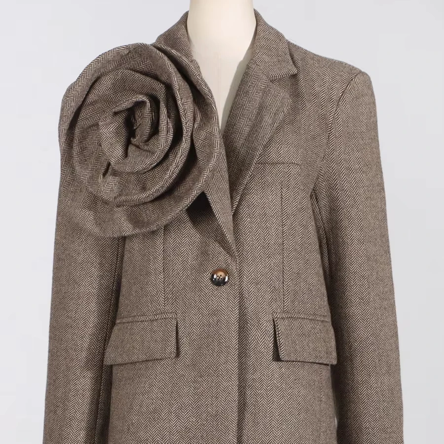 Stylish Herringbone Simgle Breasted Women's Blazer Exquisite Elegant Brown Herringbone Blazer Unique Fabric Flower Embellishment