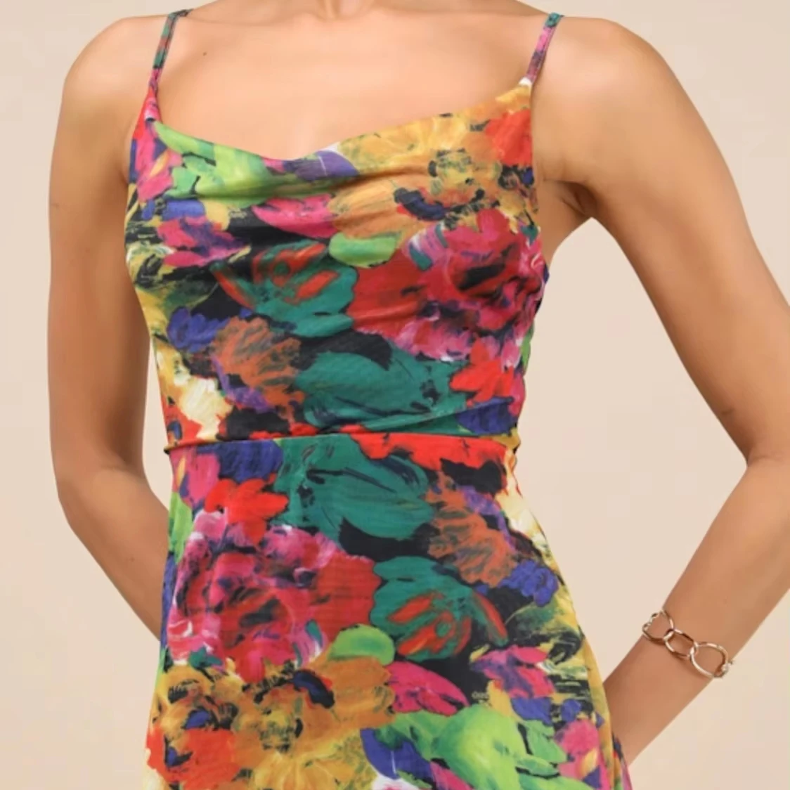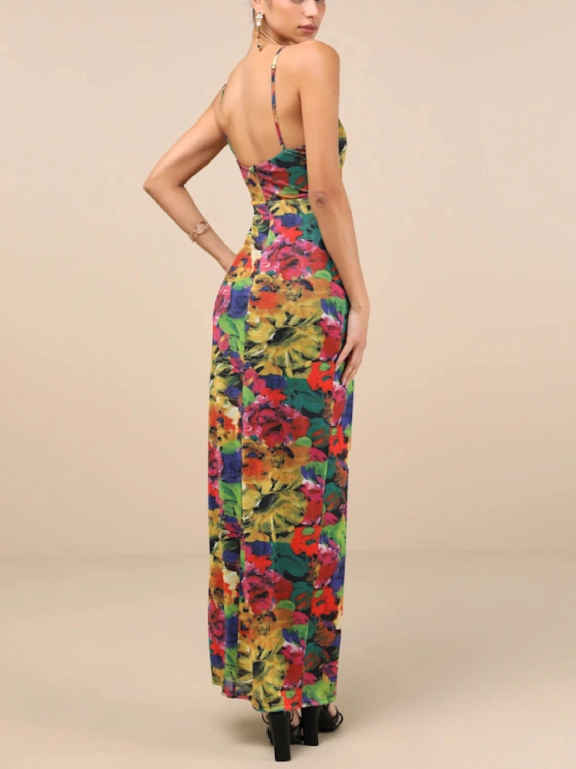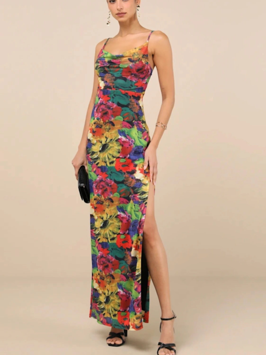 Oem Odm Manufacturer Custom Stylish Elegant Romantic Vibrant Colorful Floral Print Spaghetti Strap V Neck High Slit Maxi Dress