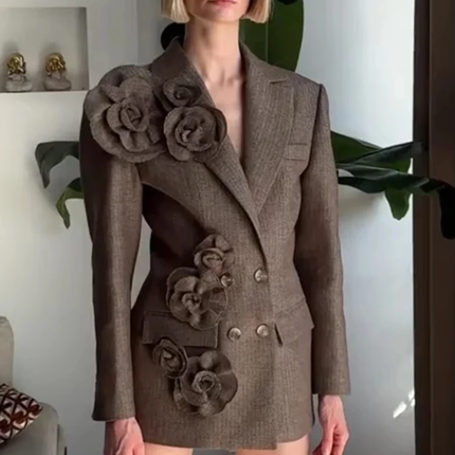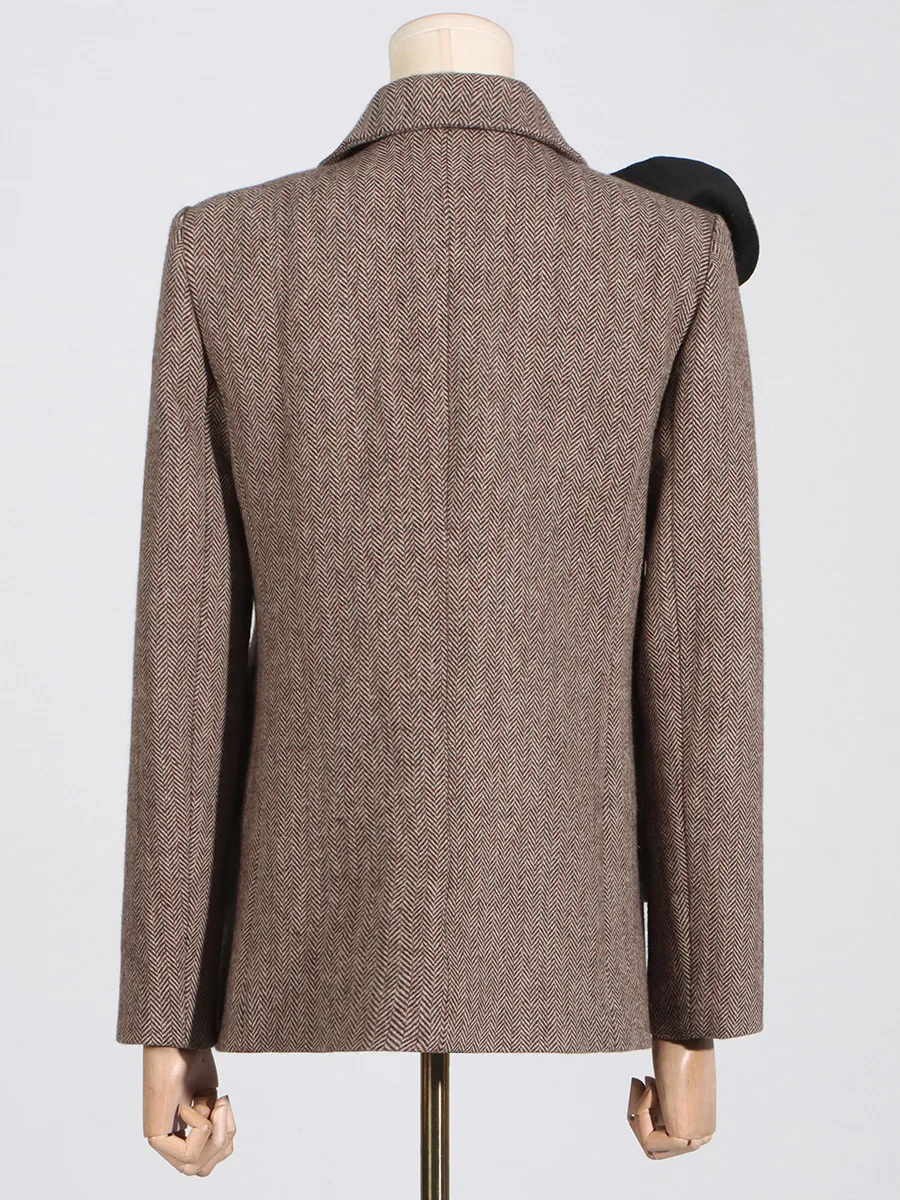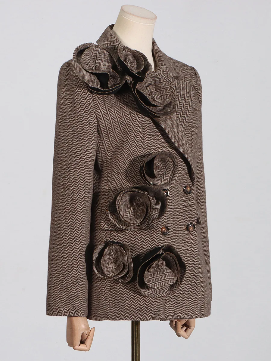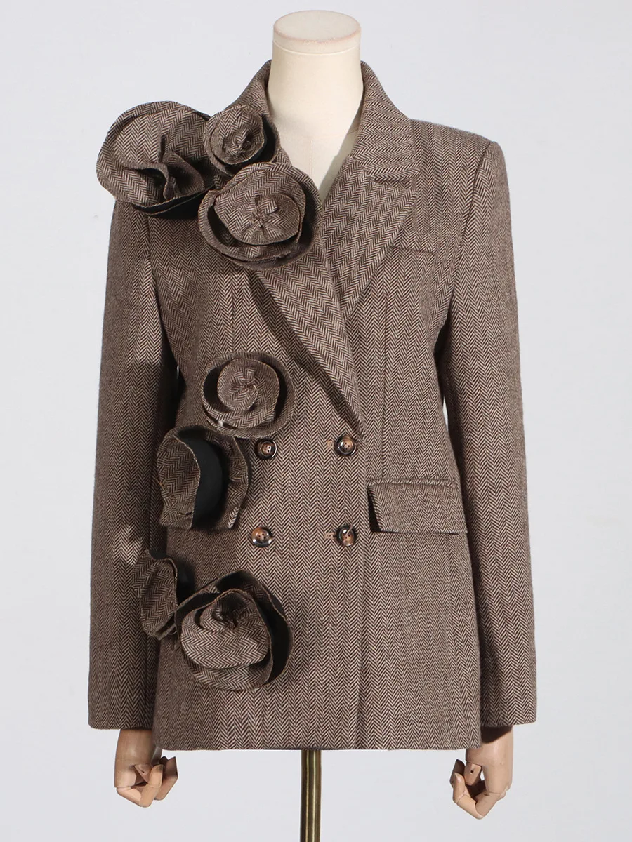 Stylish Herringbone Double Breasted Women's Blazer Exquisite Elegant Brown Herringbone Blazer Unique Fabric Flower Embellishment
