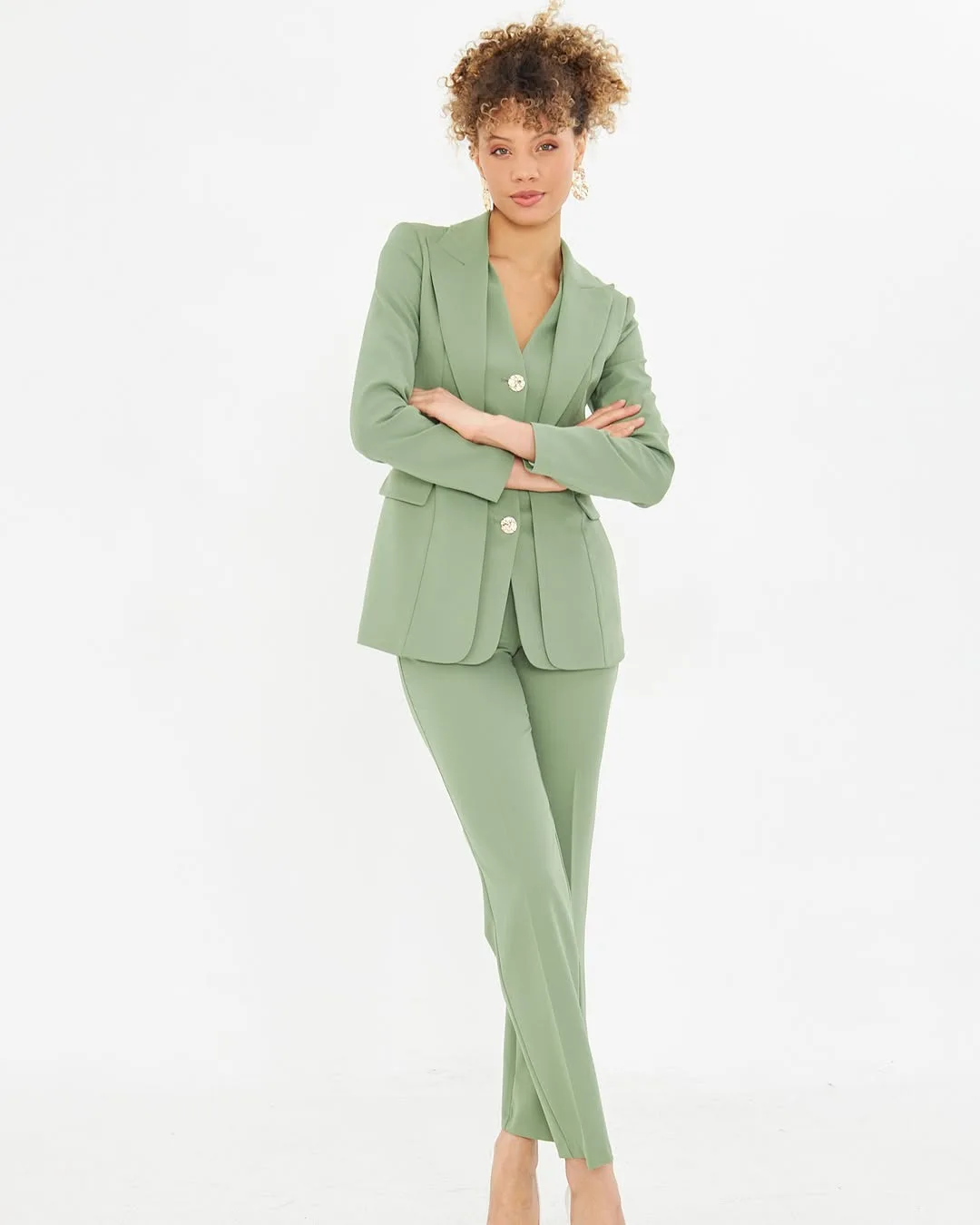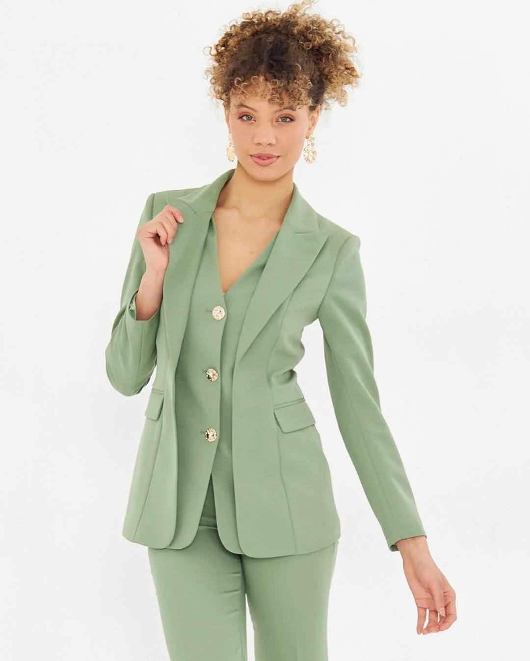 ZYHT 15545 Women's Blouses & Shirts Mint Green Tweed Blazer with Puff Sleeves & Peplum Fit Button-Detail Long Sleeve Jacket