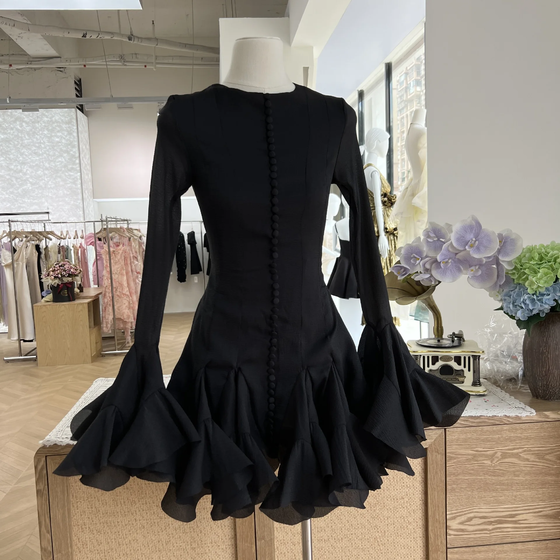 White Ruffled Long Sleeve Mini Dress with Button Front Stylish Featuring Long Flared Sleeves Ruffled Hem Custom Made