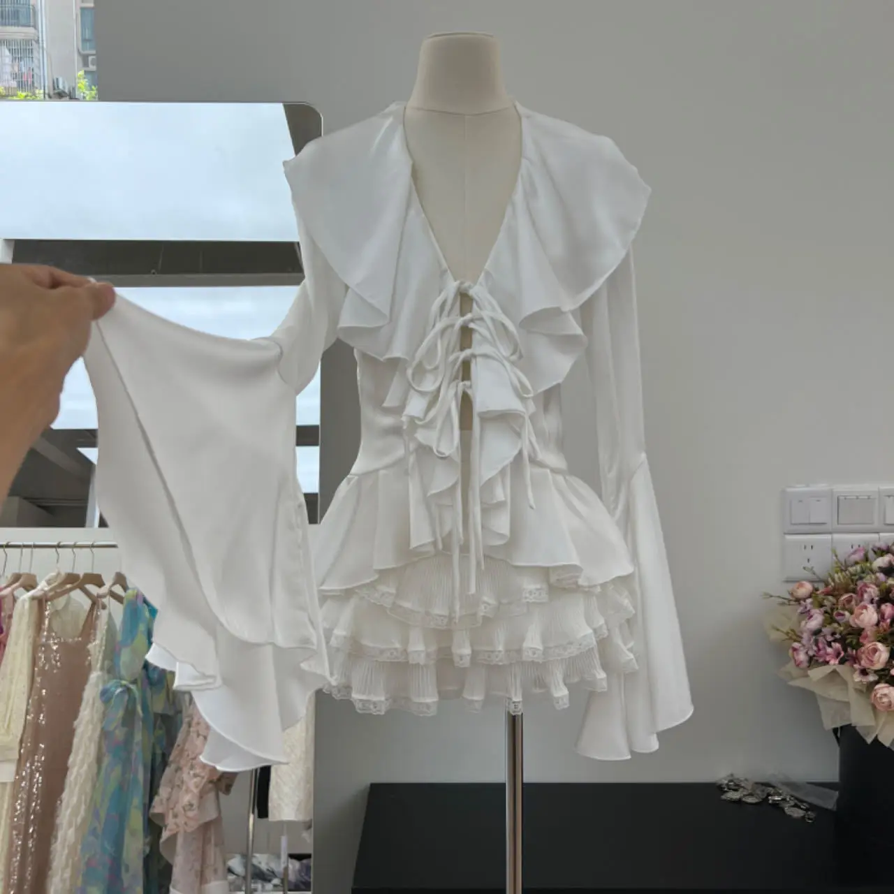 French Romantic White Ruffled Lace up Long Sleeve Top Tiered Lace Pleated Mini Skirt Two Piece Set Custom Made