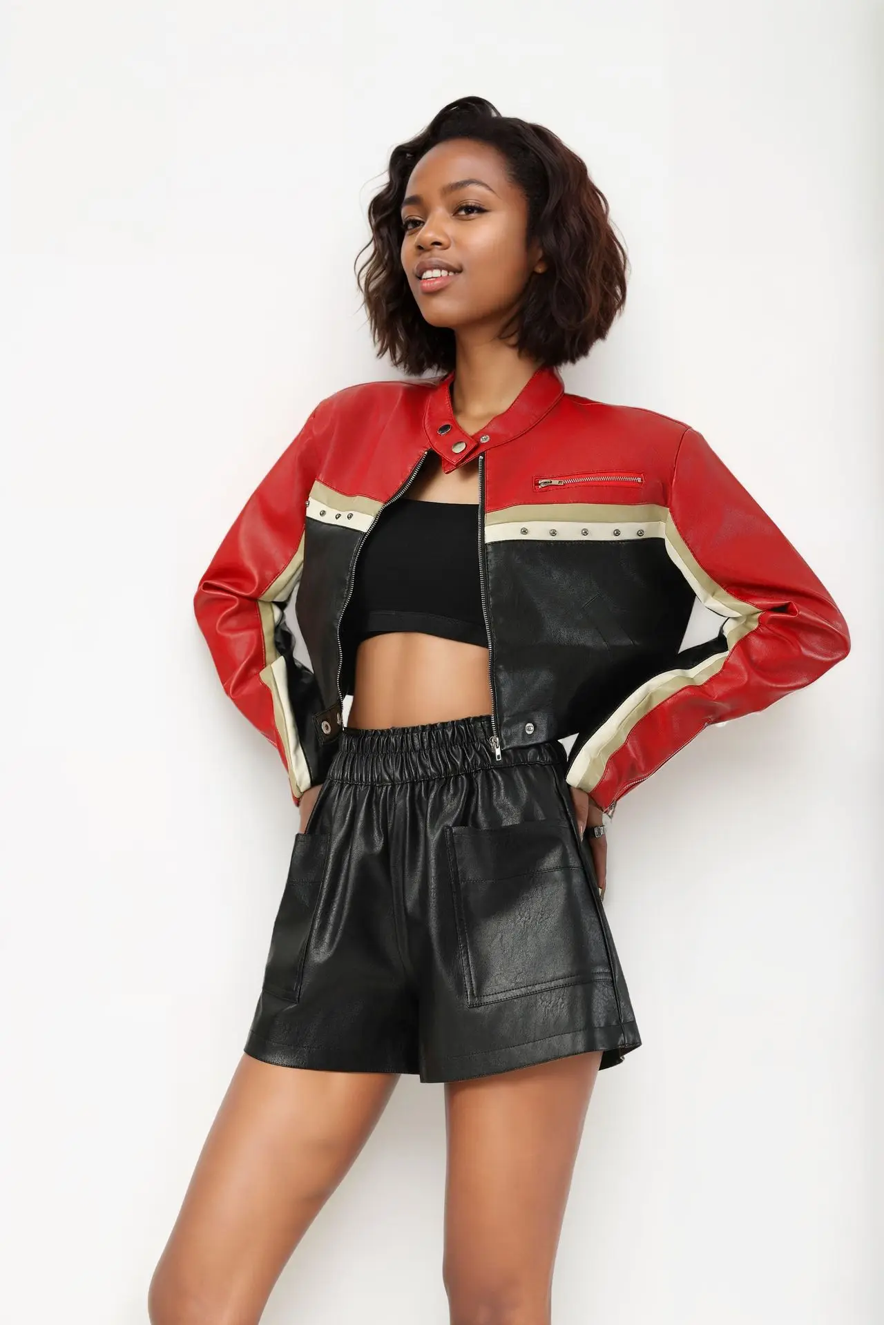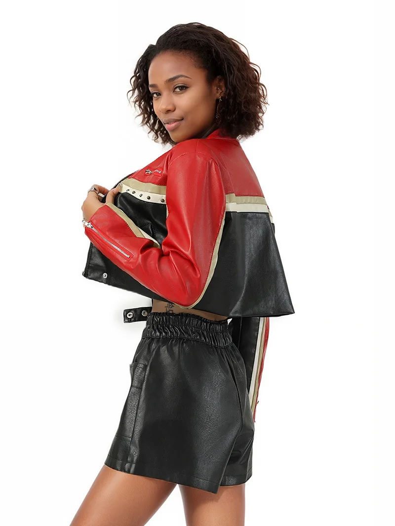 Manufacturer Oem Odm Custom Made Rivet Decorated Color Block PU Punk Black Jacket Women Short Street Style Version Fashionable