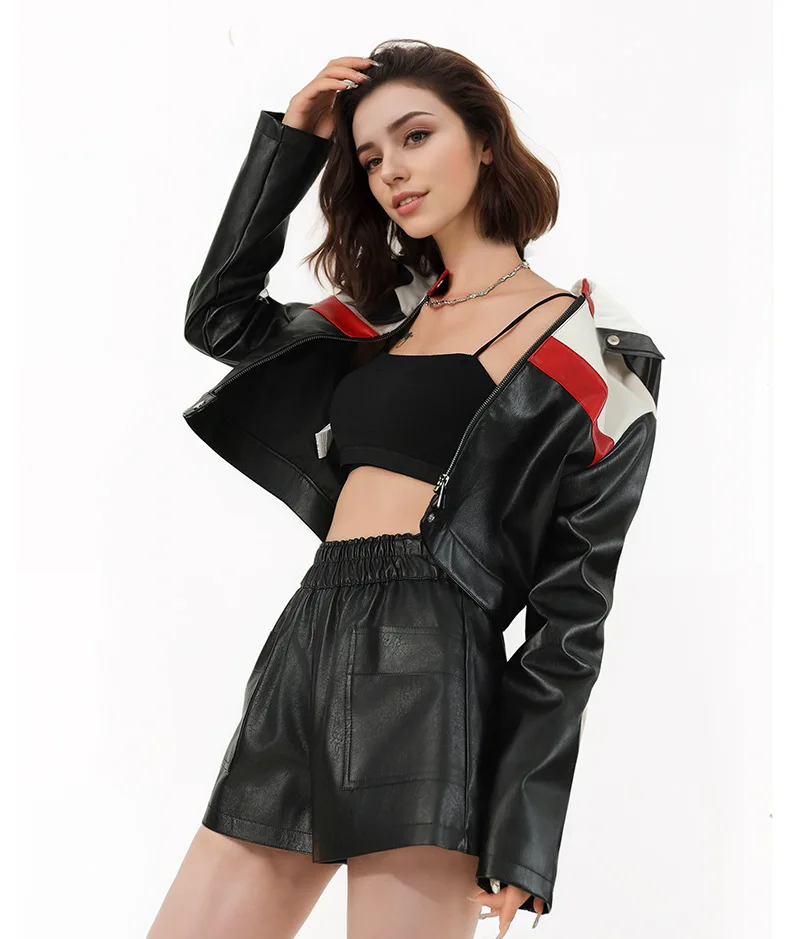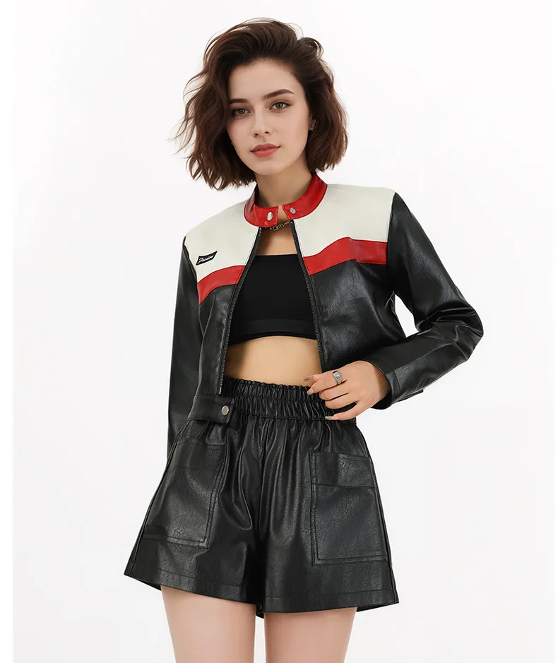 Manufacturer Oem Odm Custom Made New Contrast Color Patchwork PU Pilot Punk Black Jacket Women Short Version Fashionable