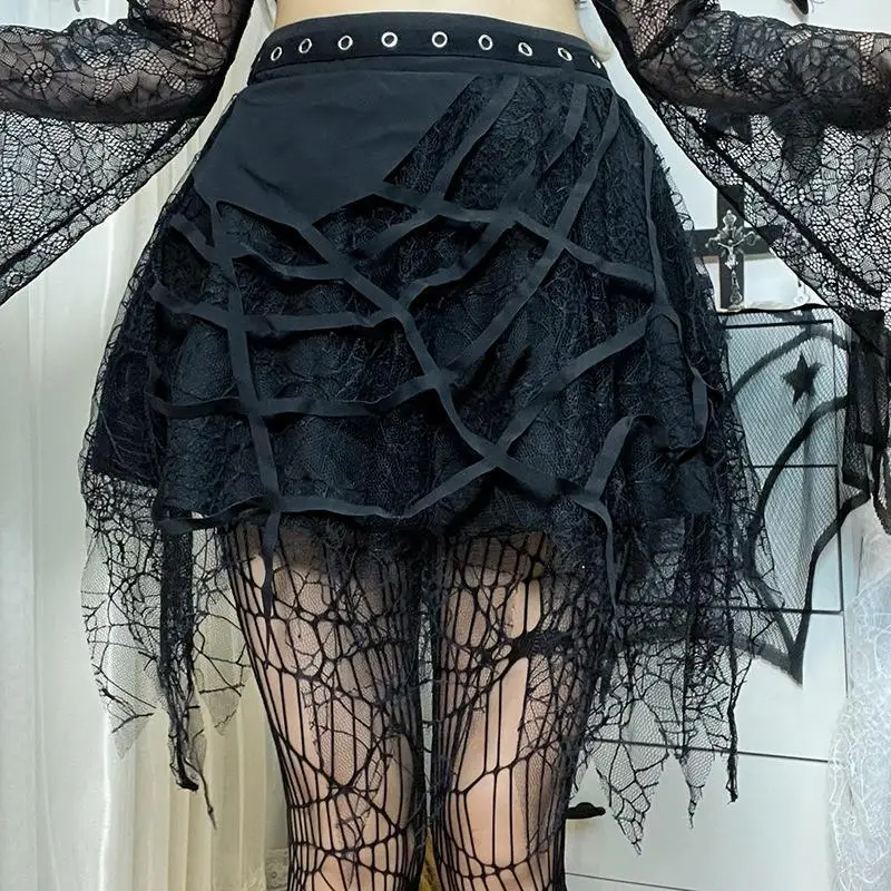 Black Gothic Punk Spider Web Design Heavy - Duty Lace Patchwork Asymmetrical Mini Skirt for Women Oem Odm Custom Made