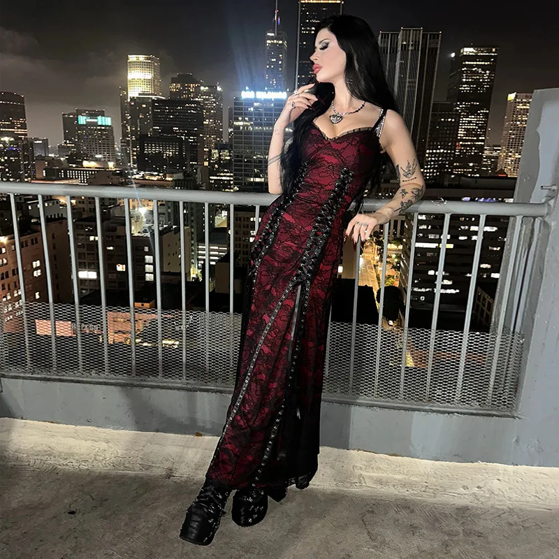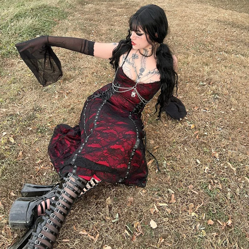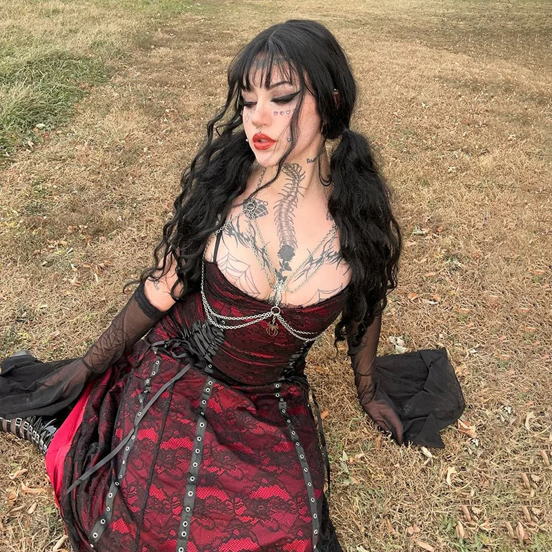 Gothic - Style Sleeveless Corset Dress with Chain Decorations and Studs, Long Skirt for Women