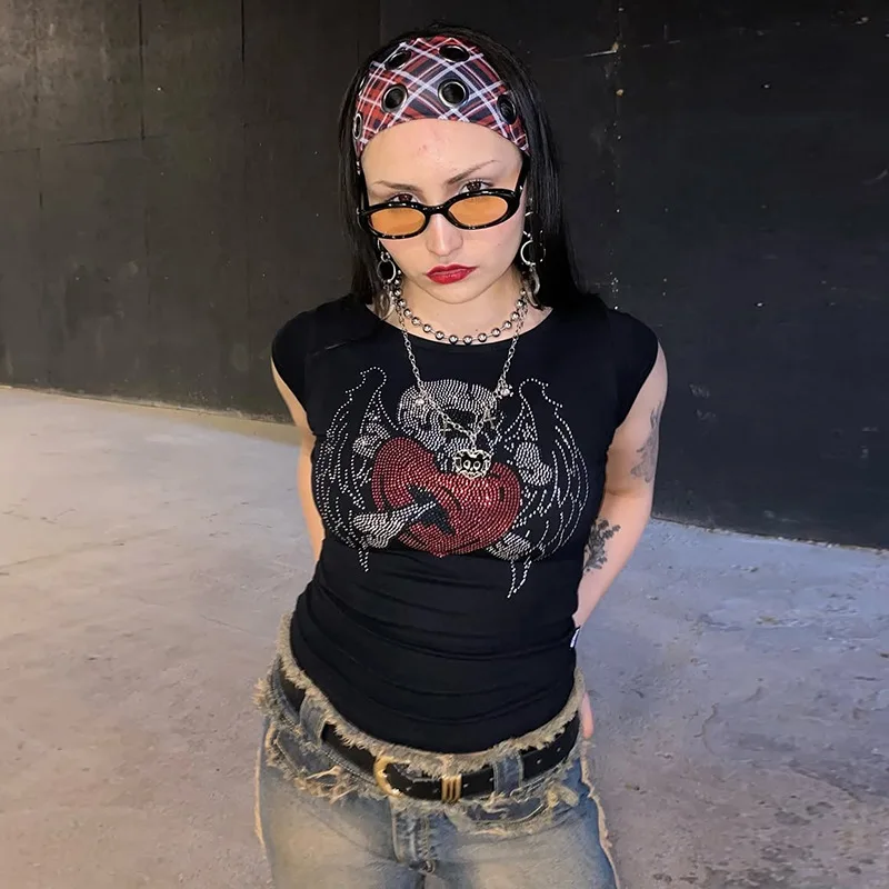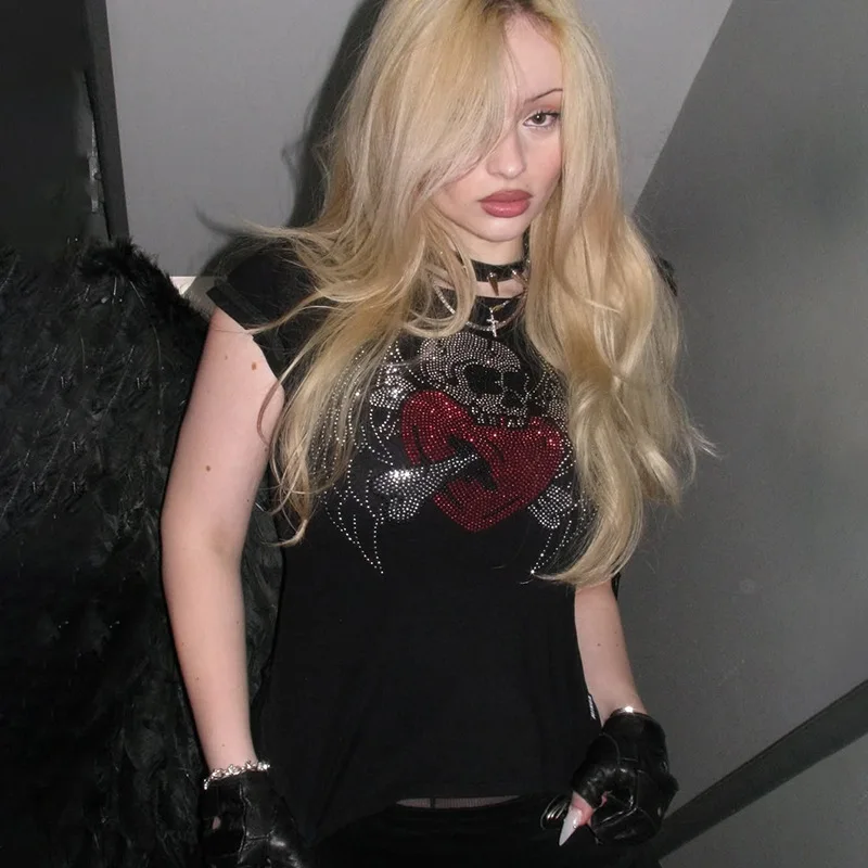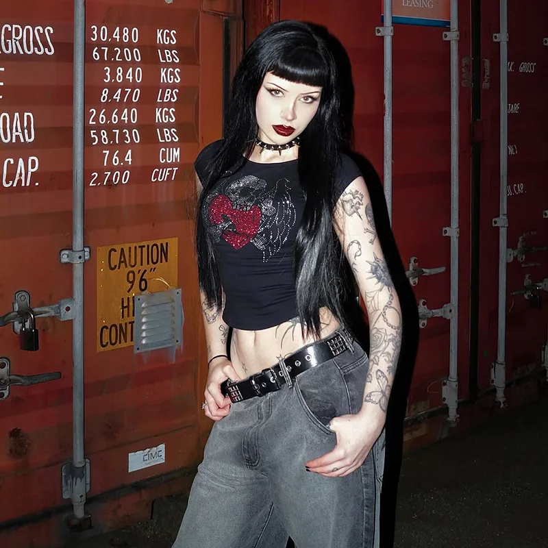 Womens Black Short Sleeve T Shirt with Skull Heart Wing Rhinestone Print -Stylish Gothic Street Wear