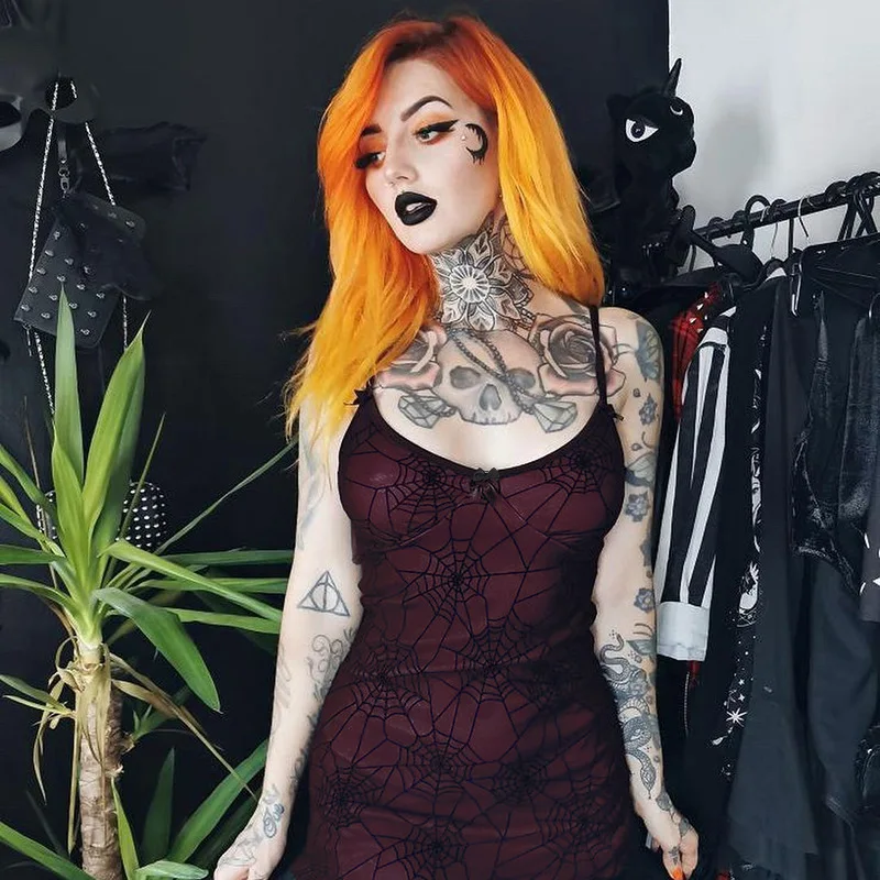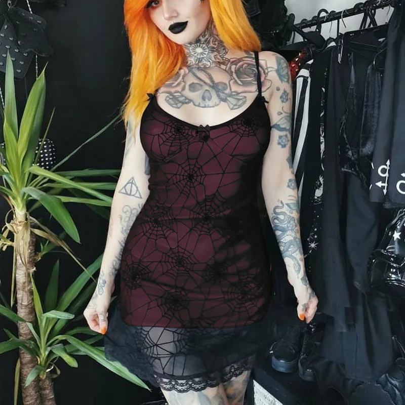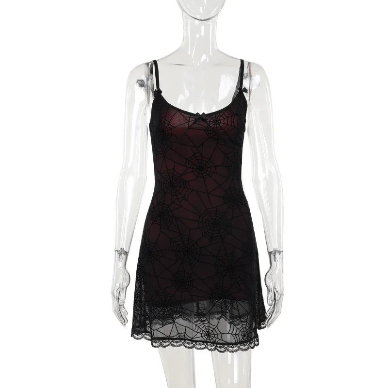 Black Sling Low - Cut Gothic Dress with Spider - Web Pattern - Ideal for Fashion & Special Occasions