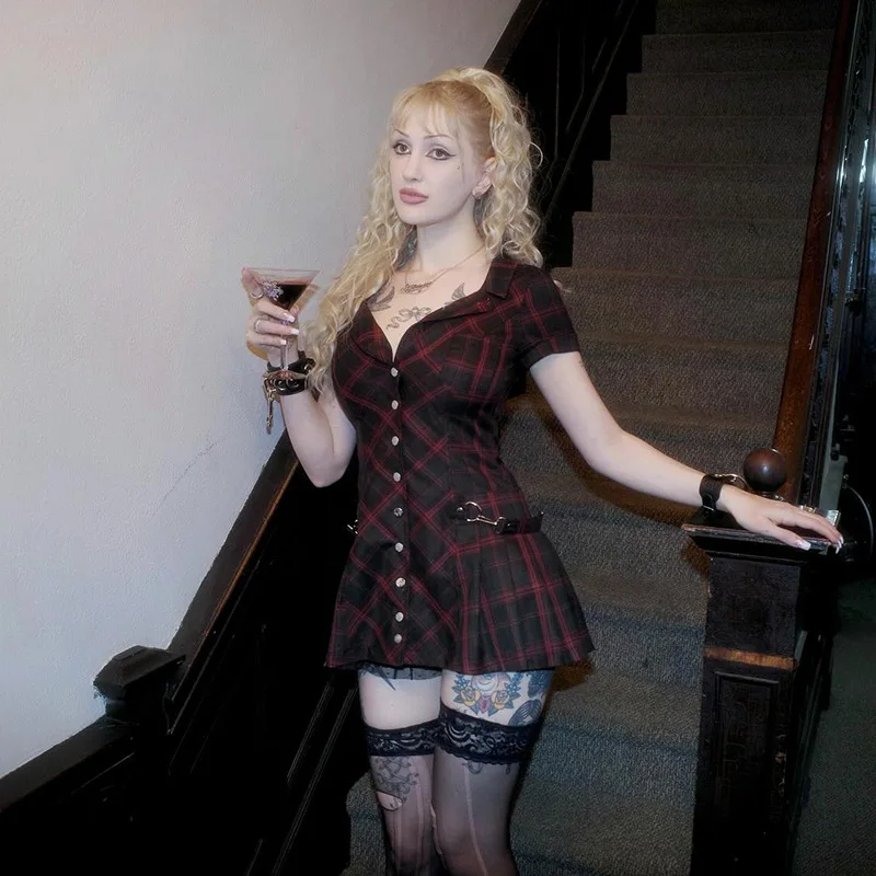 Stylish Black - Red Plaid Gothic Short - Sleeve Dress with Buttons - Ideal for Fashion & Events