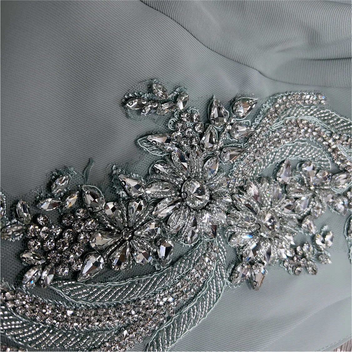 ZYHT 73903 Gemstone Crystal 3D Flower Decoration Ruched One Shoulder High Slit Long Sleeve Maxi Simple Elegant Evening Dress