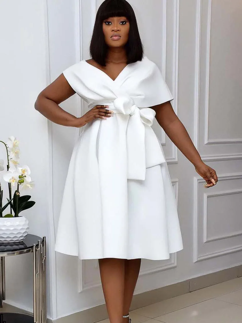 Africa Women Short Sleeve V-neck Sexy Summer Satin Solid Dress Belt Shoulder Lady Elegant A-line Big Swing Casual Dress