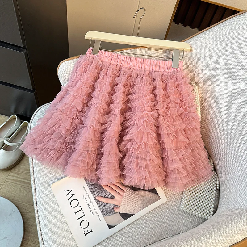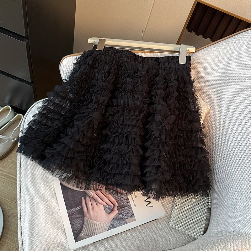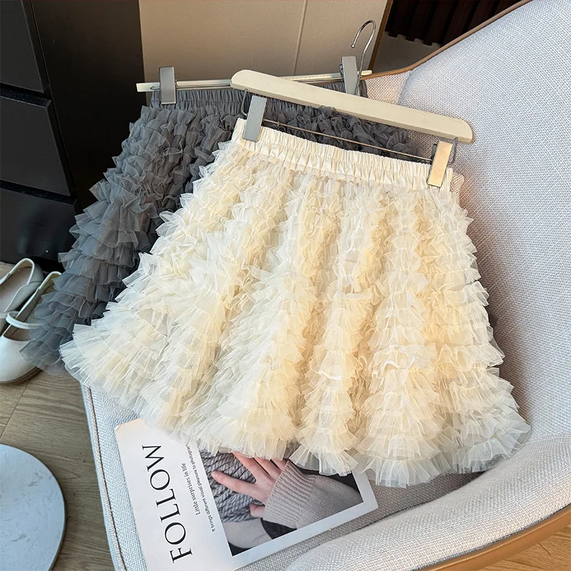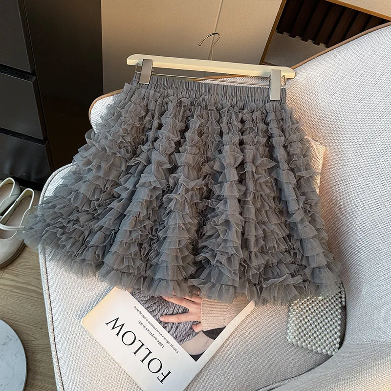 Ballet Style Pleated Mesh Anti-Wrinkle Polyester Puff Women's Autumn High Waist Slimming A-line Layered Cake Skirt