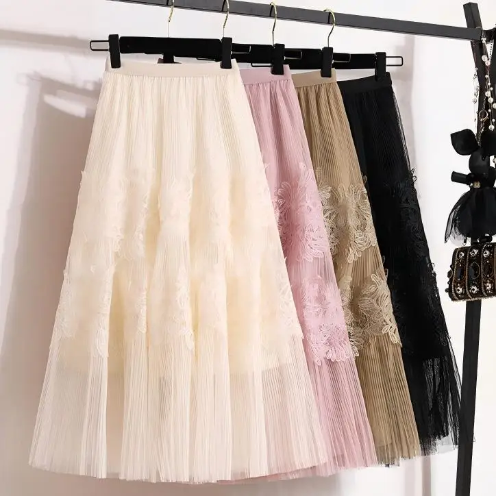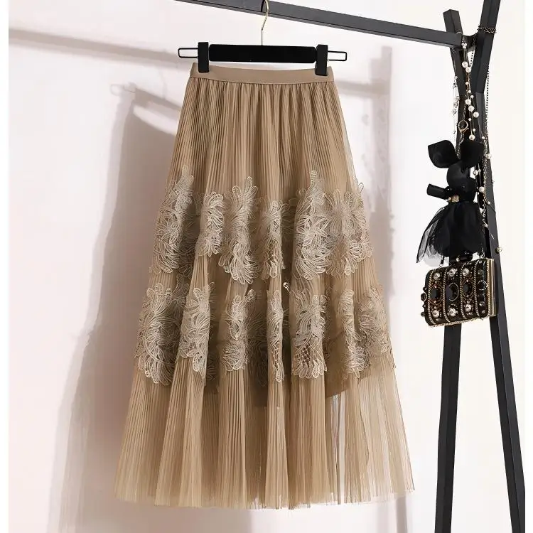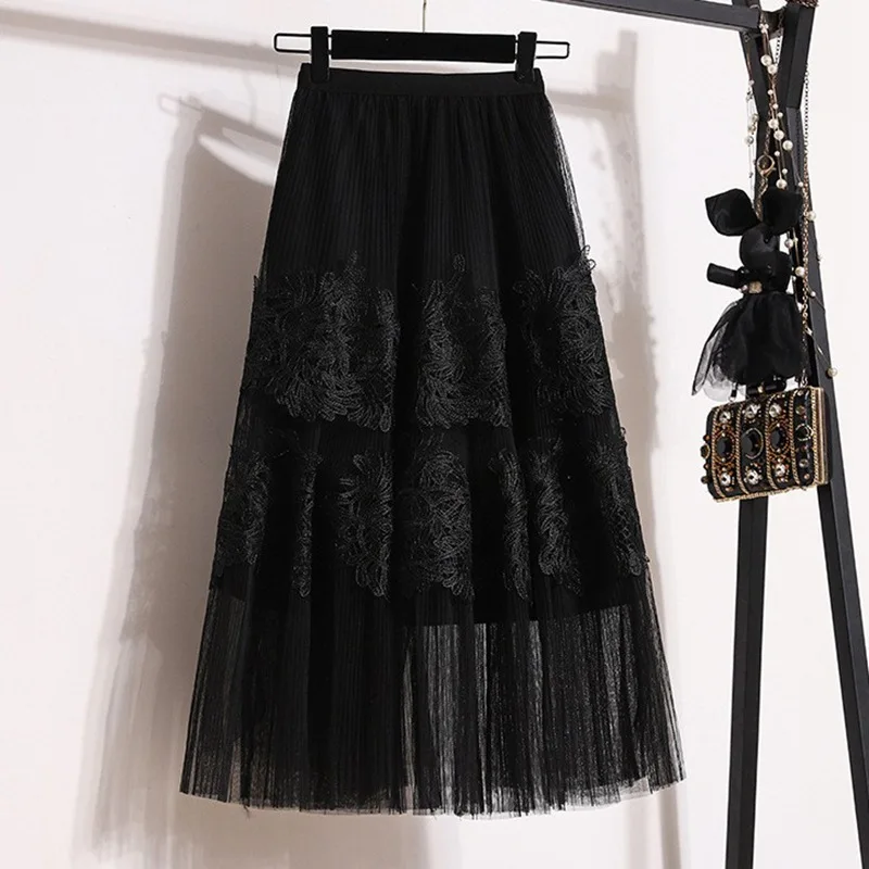 Women's High-Waisted Grace Fashion Skirt Spring Autumn Long Puff Mesh Floral with Embroidered Tulle Breathable Lace Decorated