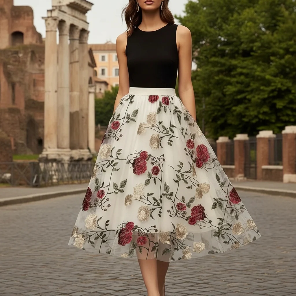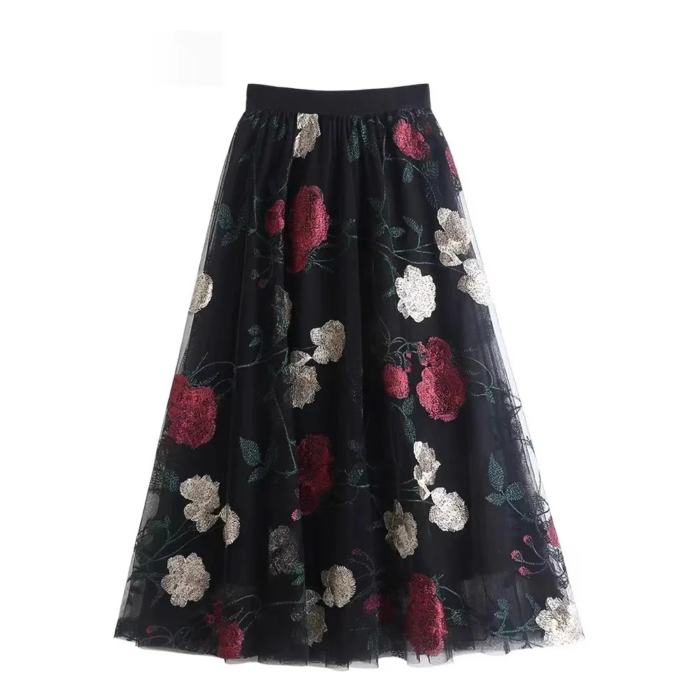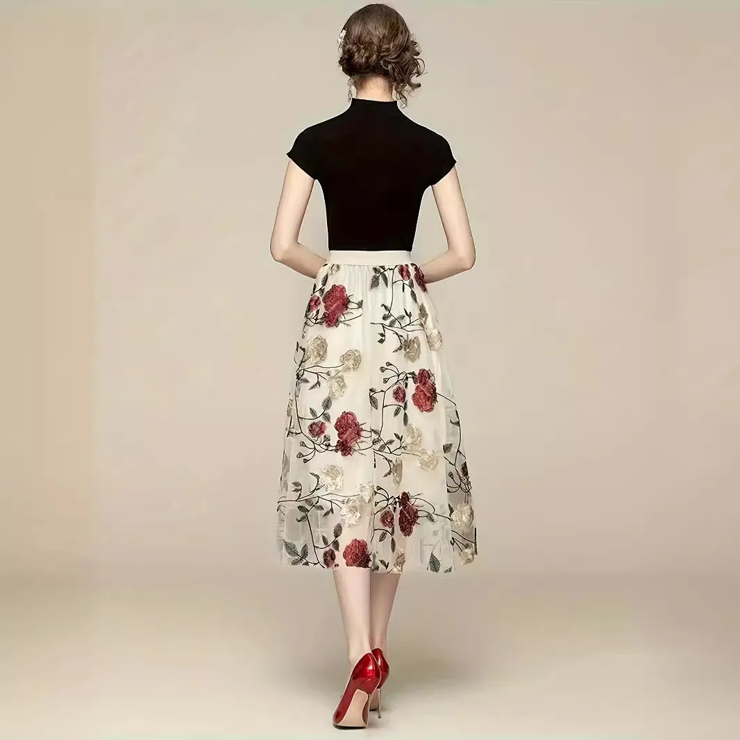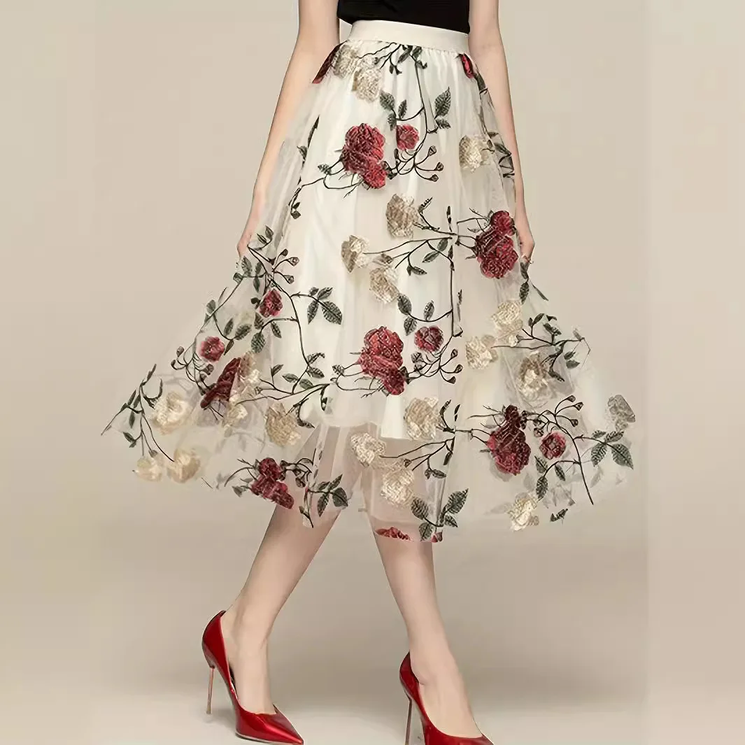 Floral Embroidery Knit Lady Women Retro Mid-Length Skirt Breathable Chiffon Lace Button Decorations Natural
