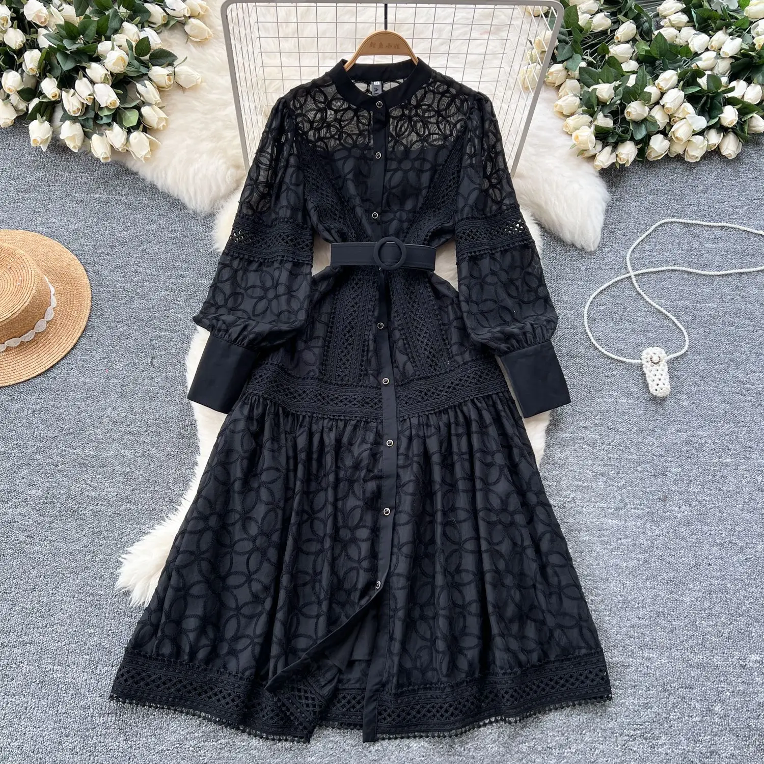 Winter Vintage Tunic Casual Maxi Dress for Women Lantern Sleeve Empire Embroidery Lace Eco-Friendly A-Line Black White