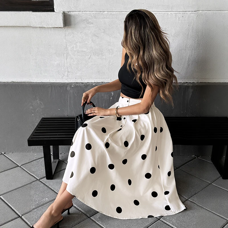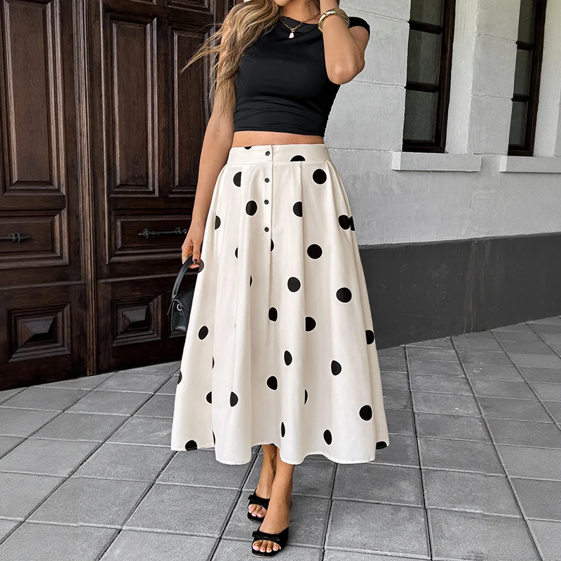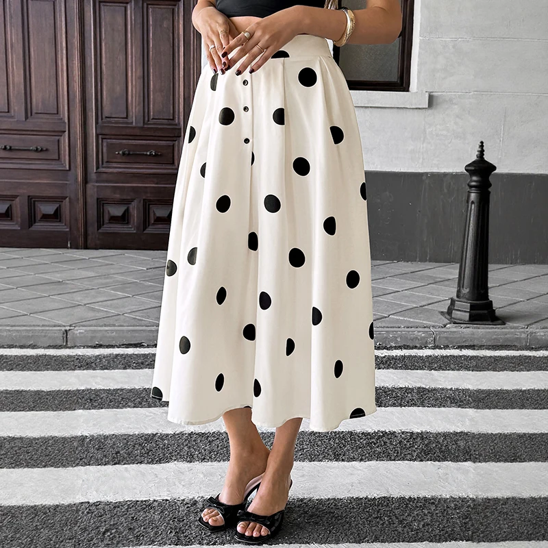 2026 New Early Fall Chic Skirt White Polka Dot Button Front High Waist A-line Skirts for Date & Evening
