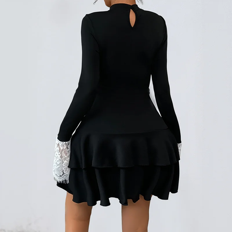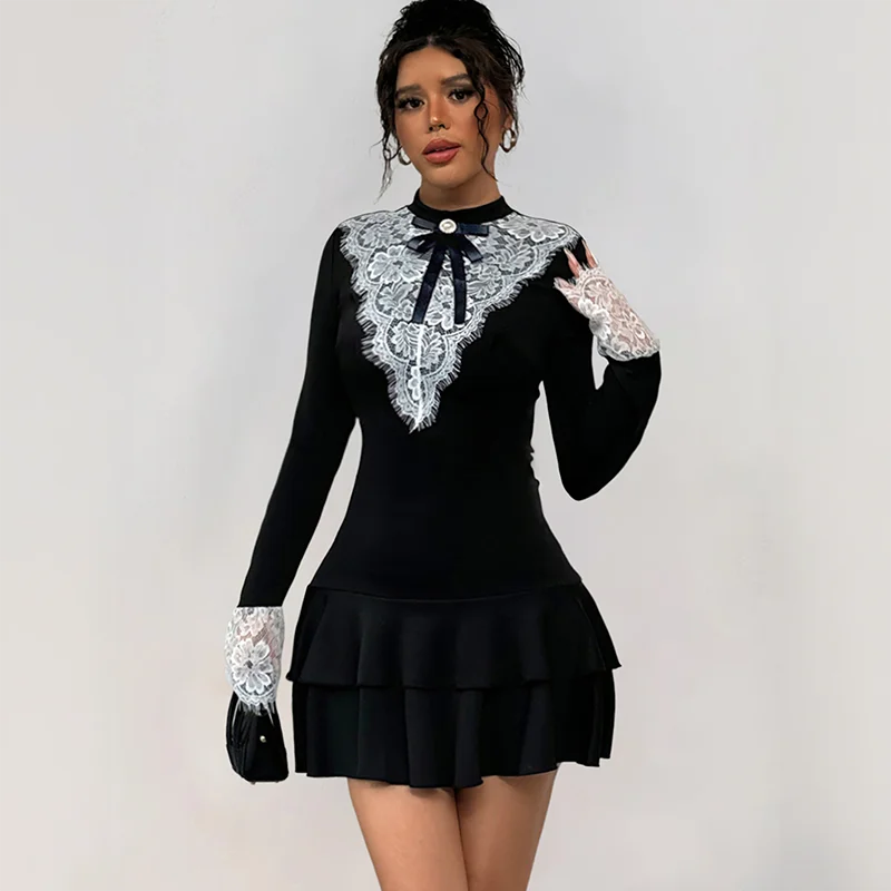 2026 New Retro Party Dress Lace Splicing Natural Waistline Front Logo Solid Pattern Knee Length Casual Style for Autumn