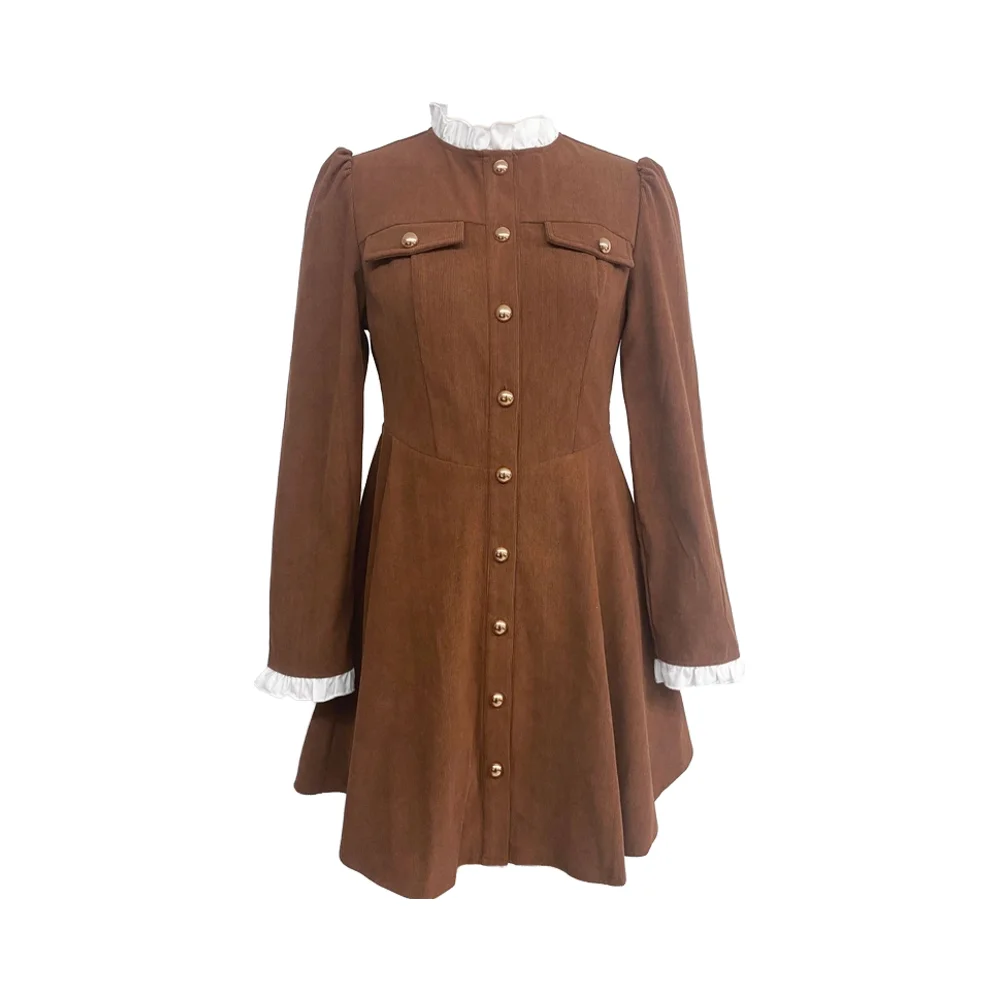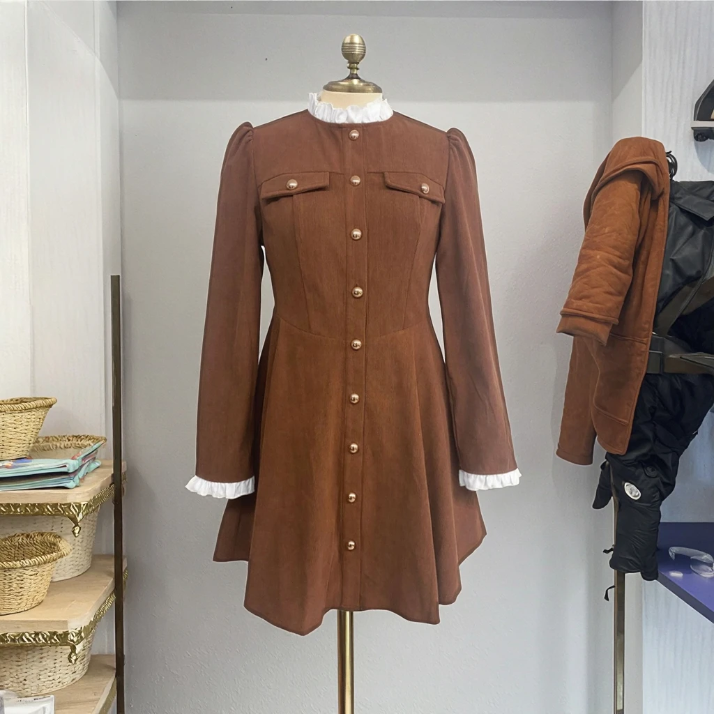 Vintage Burgundy Satin Corduroy Career Dress Long Sleeve Button Collar Gold Buttons Embroidered Front Logo Formal for Winter